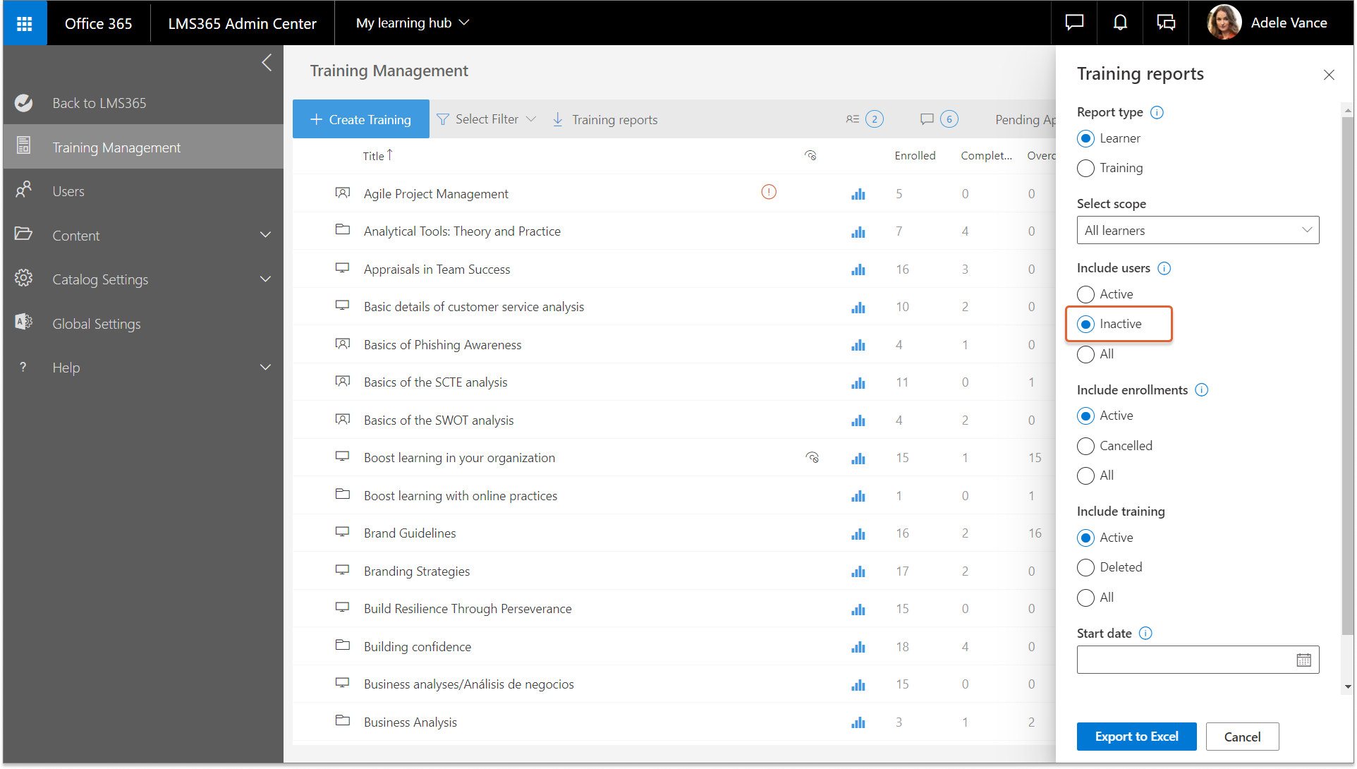 To download reports about inactive users, in the Learn365 Admin Center, navigate to Training Management and select Training reports. The report will include information about inactive users only. Find more information about catalog reports on training and users, see this article.