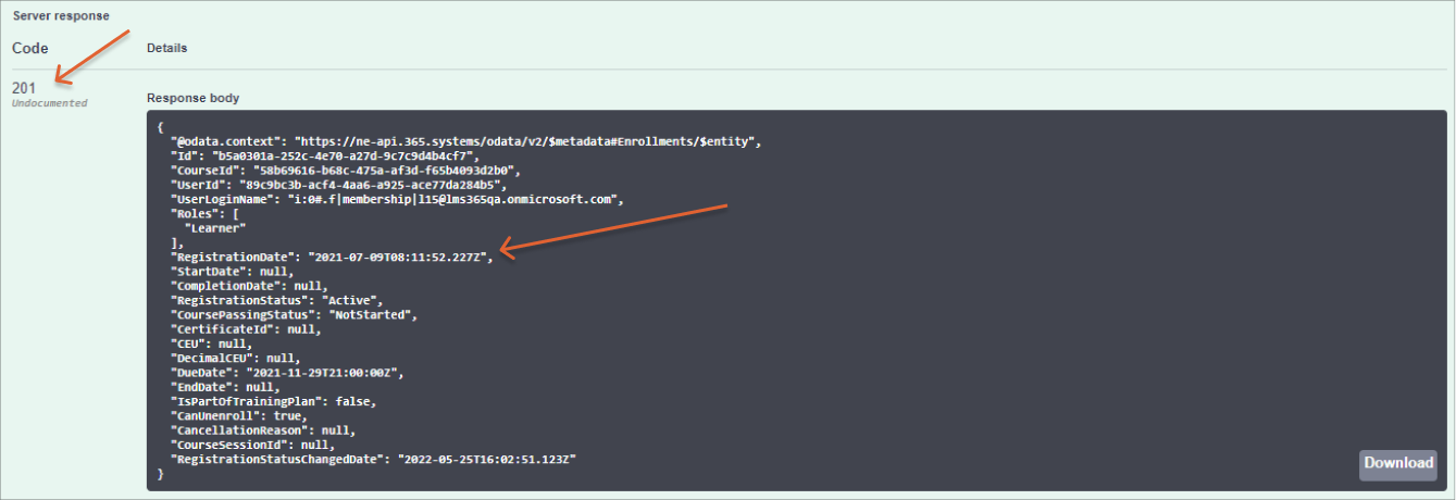 - In the Response body field, you can see the results of the request - the user's enrollment and registrations are displayed. Also, in the RegistrationDate line, you can find the date and time of the user's enrollment. The user or group are enrolled in the course and receive the corresponding notifications.