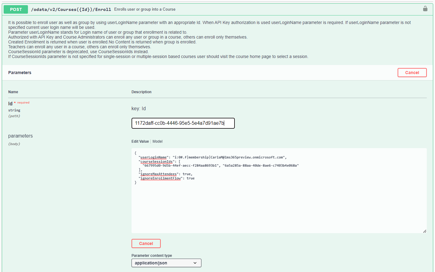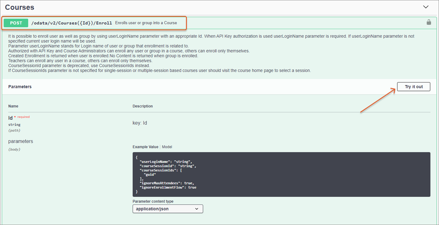 2. In the Courses section, select the POST /odata/v2/Courses({Id})/Enroll endpoint and select Try it out.