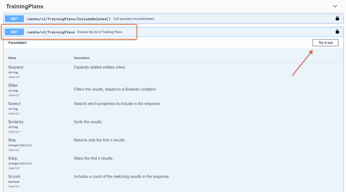2. Find the Training Plans section, expand it, find the GET method /odata/v2/TrainingPlans with the Return the list of Training Plans description and then click Try it out in the top left corner.