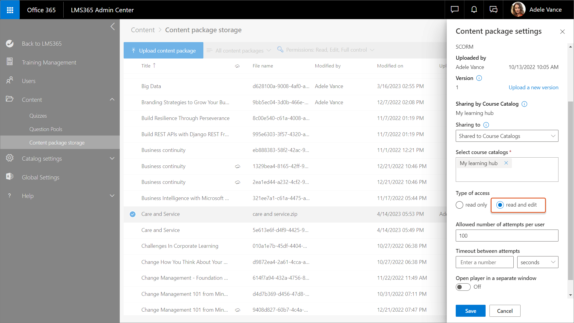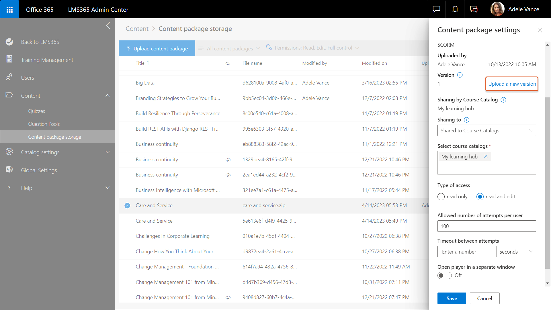 In the Learn365 Admin Center, go to Training Management and select any course that contains the relevant content package. The Course management panel opens.