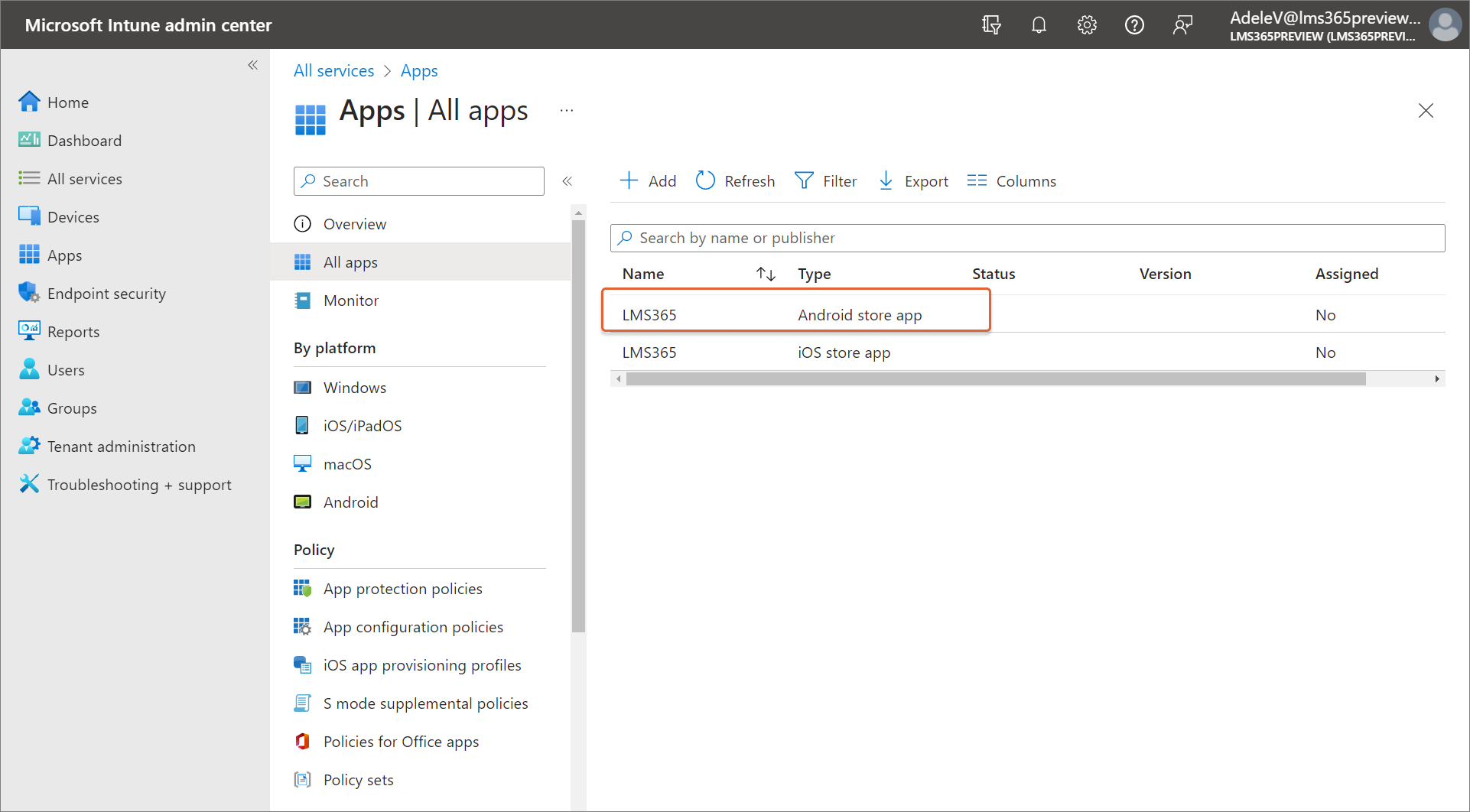 As a result, the Learn365 mobile app in the Android store that you've added is displayed in the Microsoft Intune admin center > Apps > All apps.