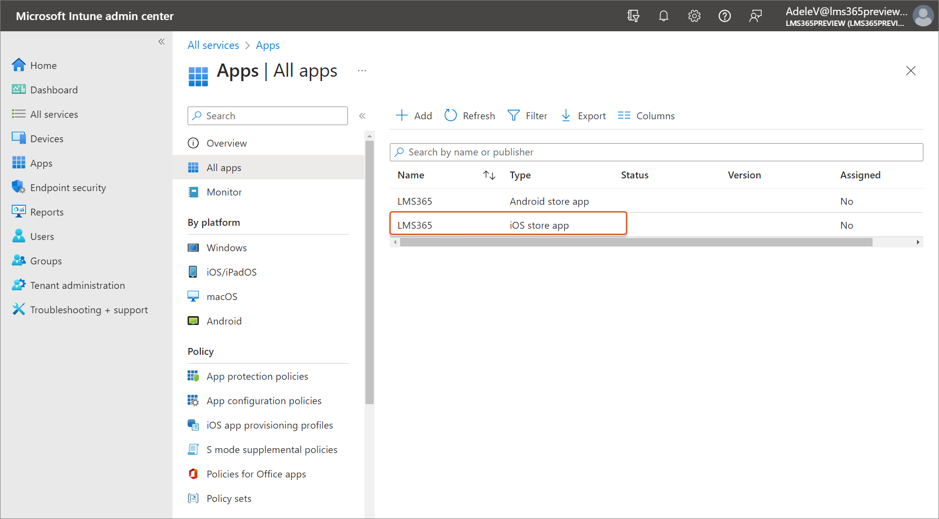 As a result, the Learn365 mobile app in the iOS store that you've added is displayed in the Microsoft Intune admin center > Apps > All apps.