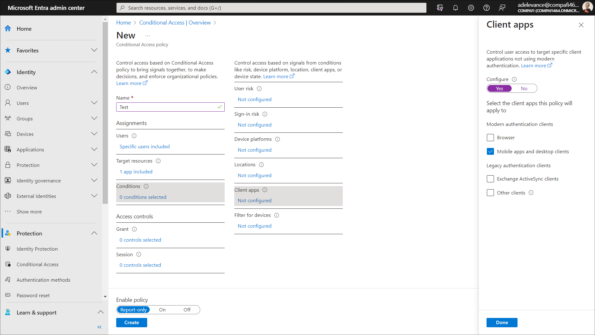 6. On the opened Clients apps panel, configure user access to target specific client applications that don't use modern authentication. Set the Configure toggle to Yes to be able to configure the client apps to which this policy will apply.