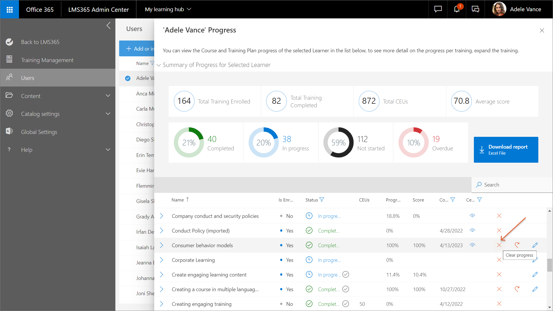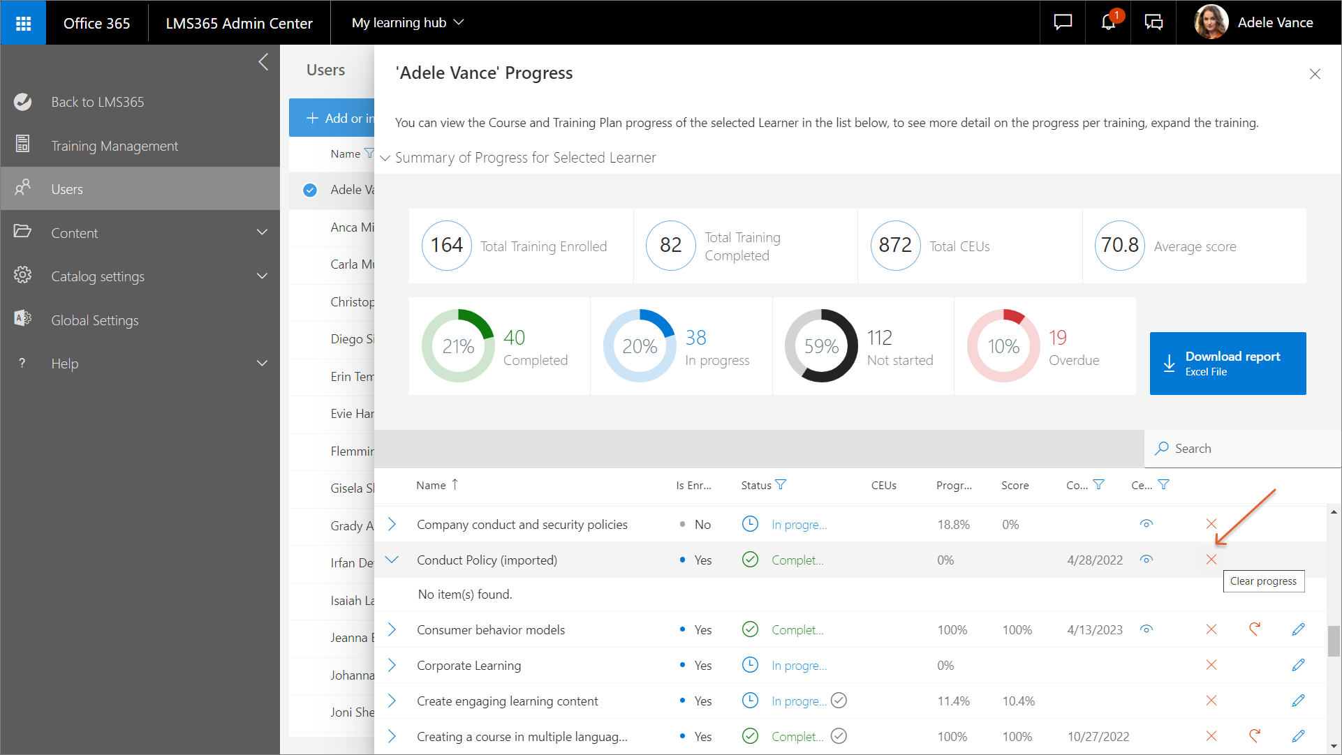 To remove the progress, navigate to Users > select a learner > View Learner's Progress > select the relevant course (when expanded, imported external training have No Item(s) found displayed) > Clear progress. This action will delete all the course records and progress. The deletion can't be undone.