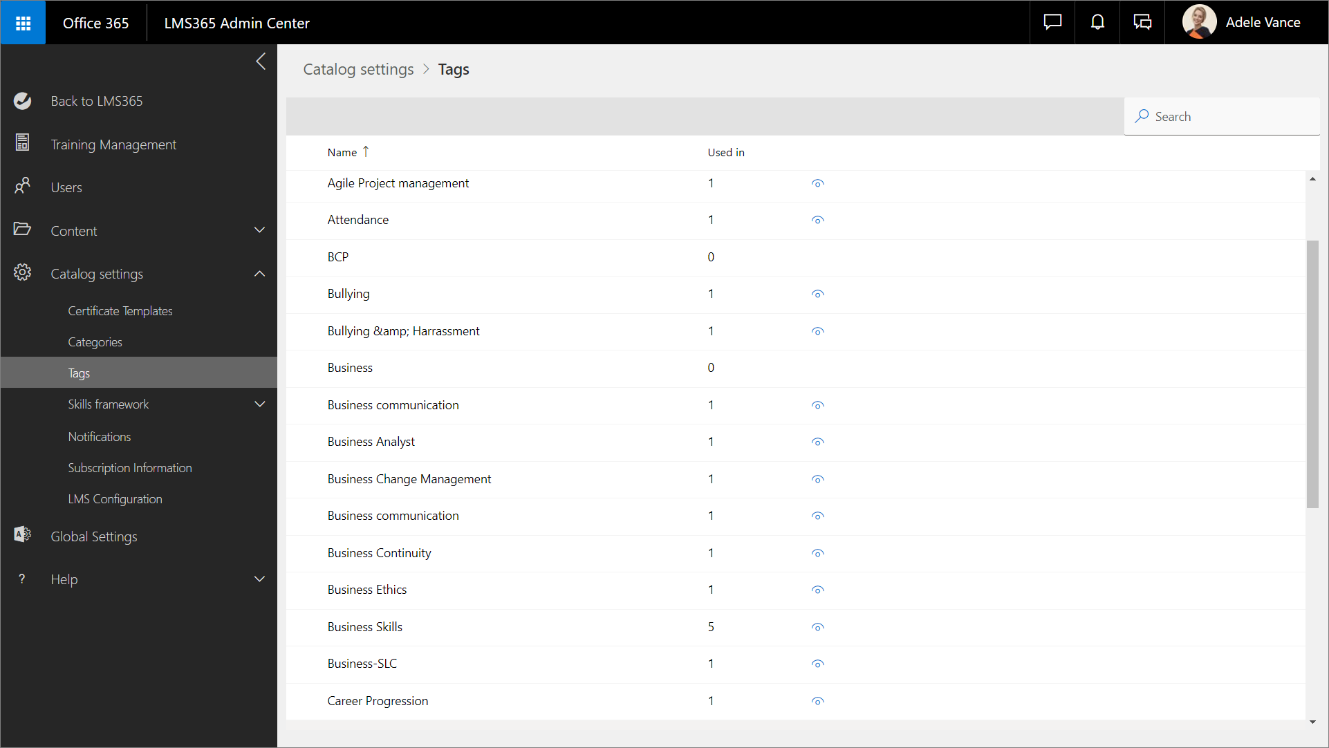 1. Navigate to the Learn365 Admin Center > Catalog settings > Tags.