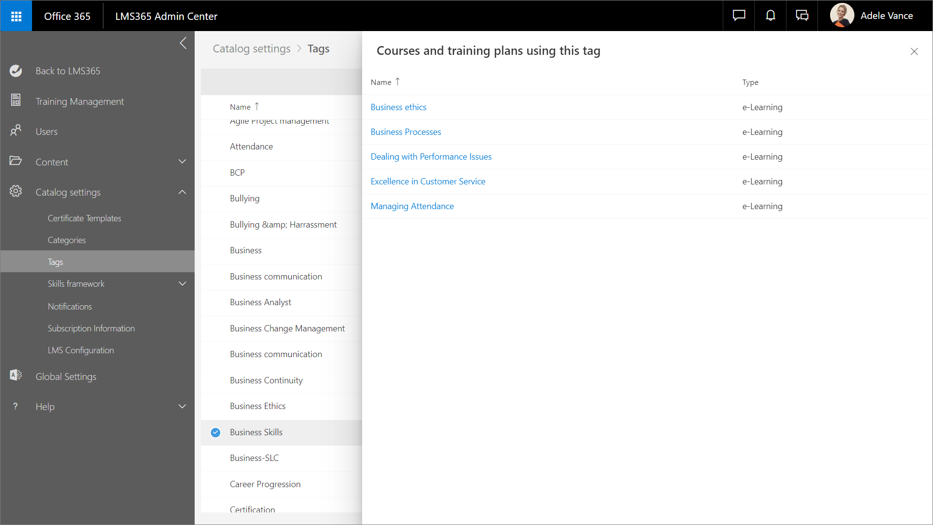 Tags created in courses or training plans will be added to both the list of tags of the current catalog, and the course or training plan in which they were created. The catalog admin manages tags from the Learn365 Admin Center > Catalog settings > Tags.