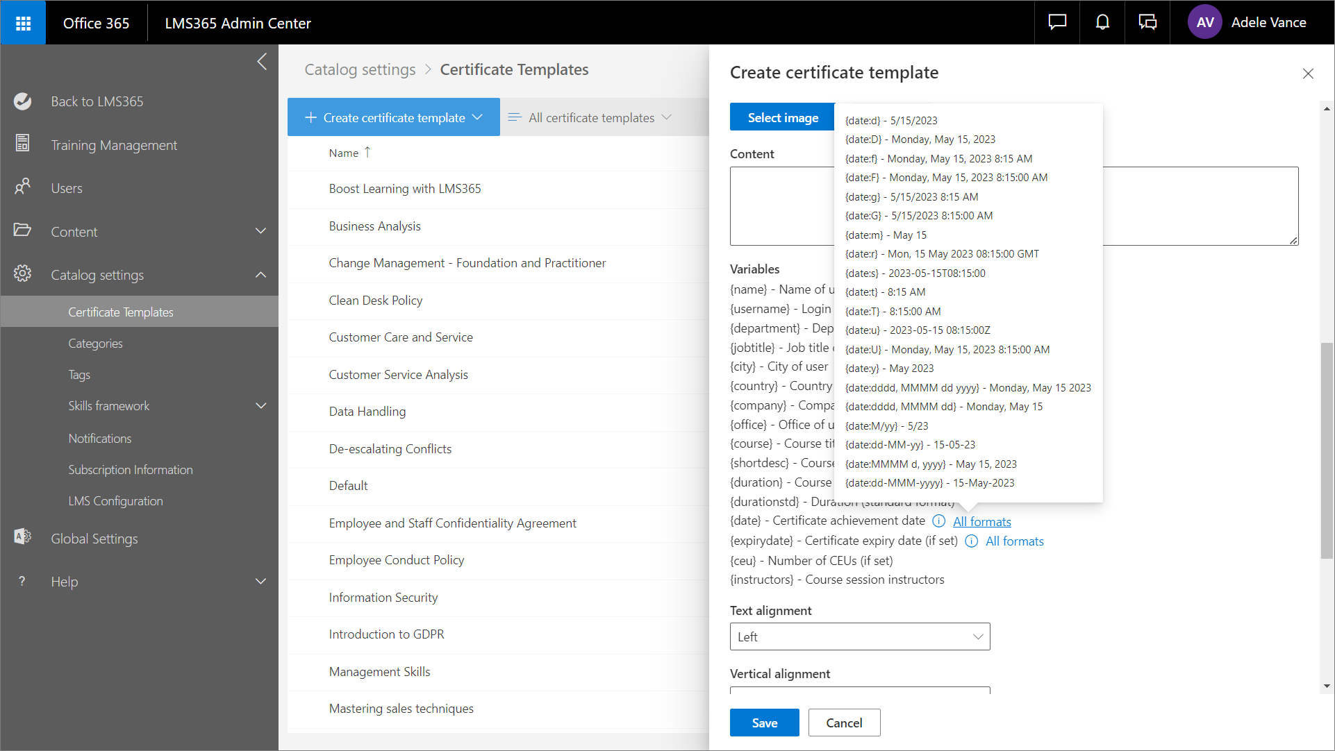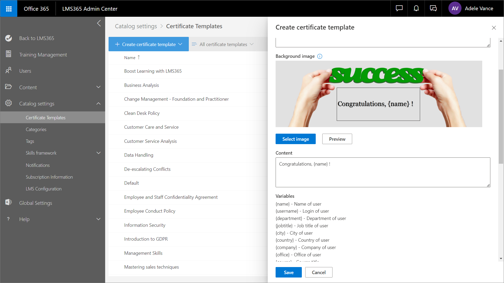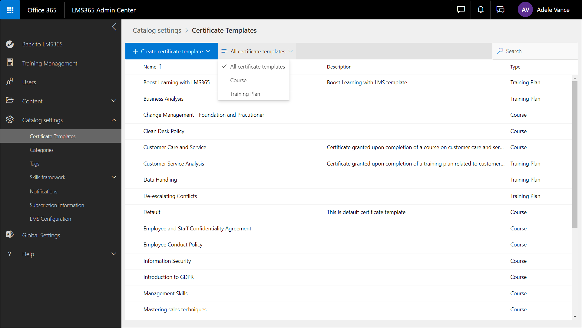 1. Go to the Learn365 Admin Center > Catalog settings > Certificate Templates.
