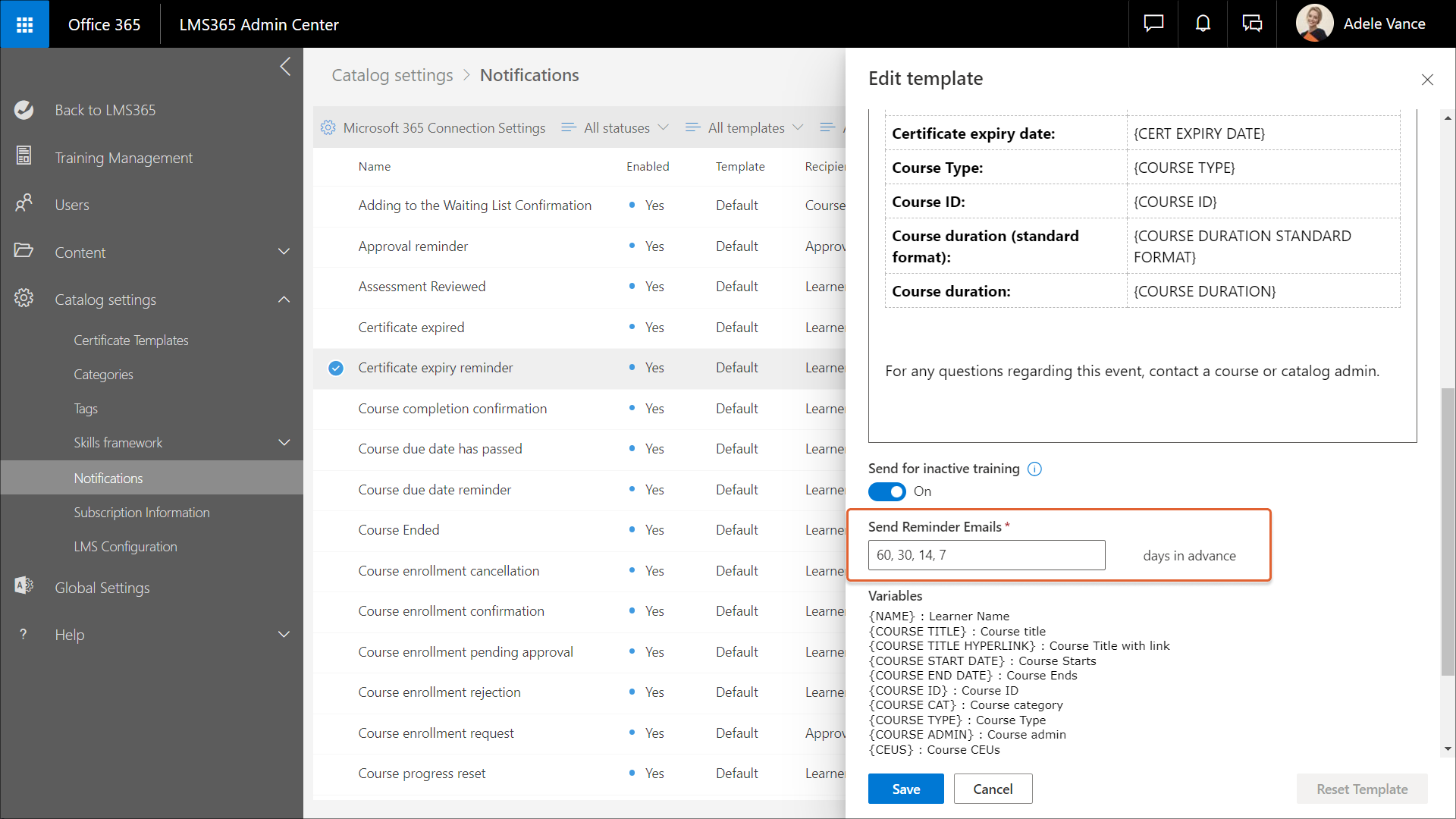 1. Go to the Learn365 Admin Center > Catalog settings > Notifications.