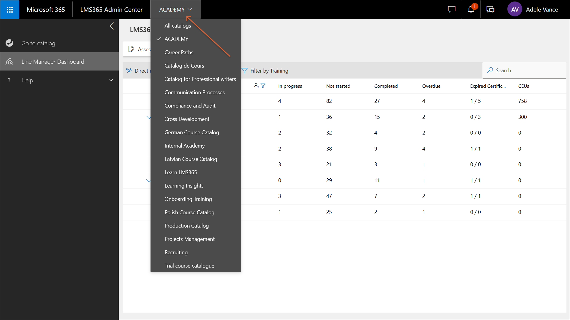 - They're an LMS admin. In this case, the line manager will see all catalogs of the tenant in the list.