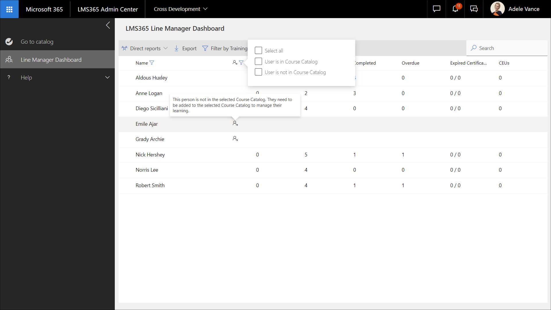 Line managers can see users who aren't currently enrolled in any courses or training plans in the catalog.
