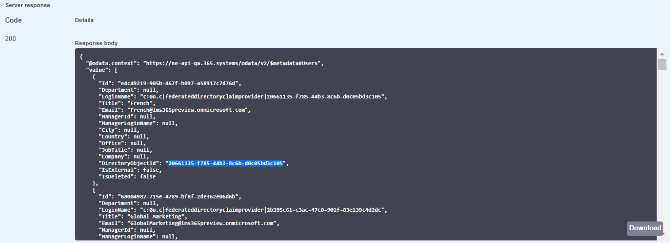 "sourceUserLoginName": "string" - Replace string with the DirectoryObjectId of the secondary account you want to merge into the primary one. When the accounts have been merged, the secondary account will be removed from the Users page of the Learn365 Admin Center but will remain in Microsoft Entra ID.