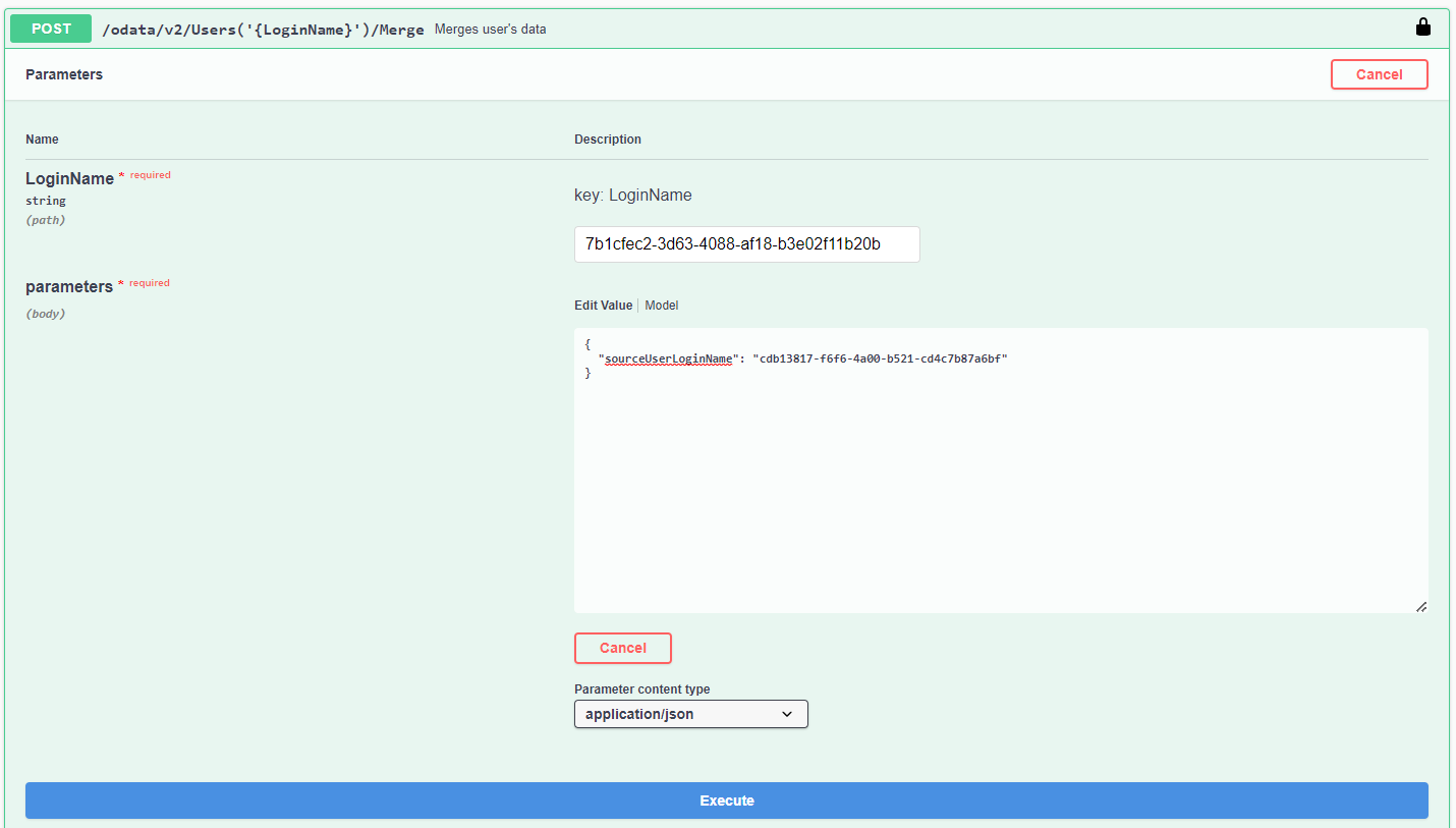 - key: LoginName - Enter the DirectoryObjectId of the primary account you want to save and to inherit the merged data from the other account. After the merge, the data of the primary account will be preserved and the training record data of the secondary account will be merged into the primary one.