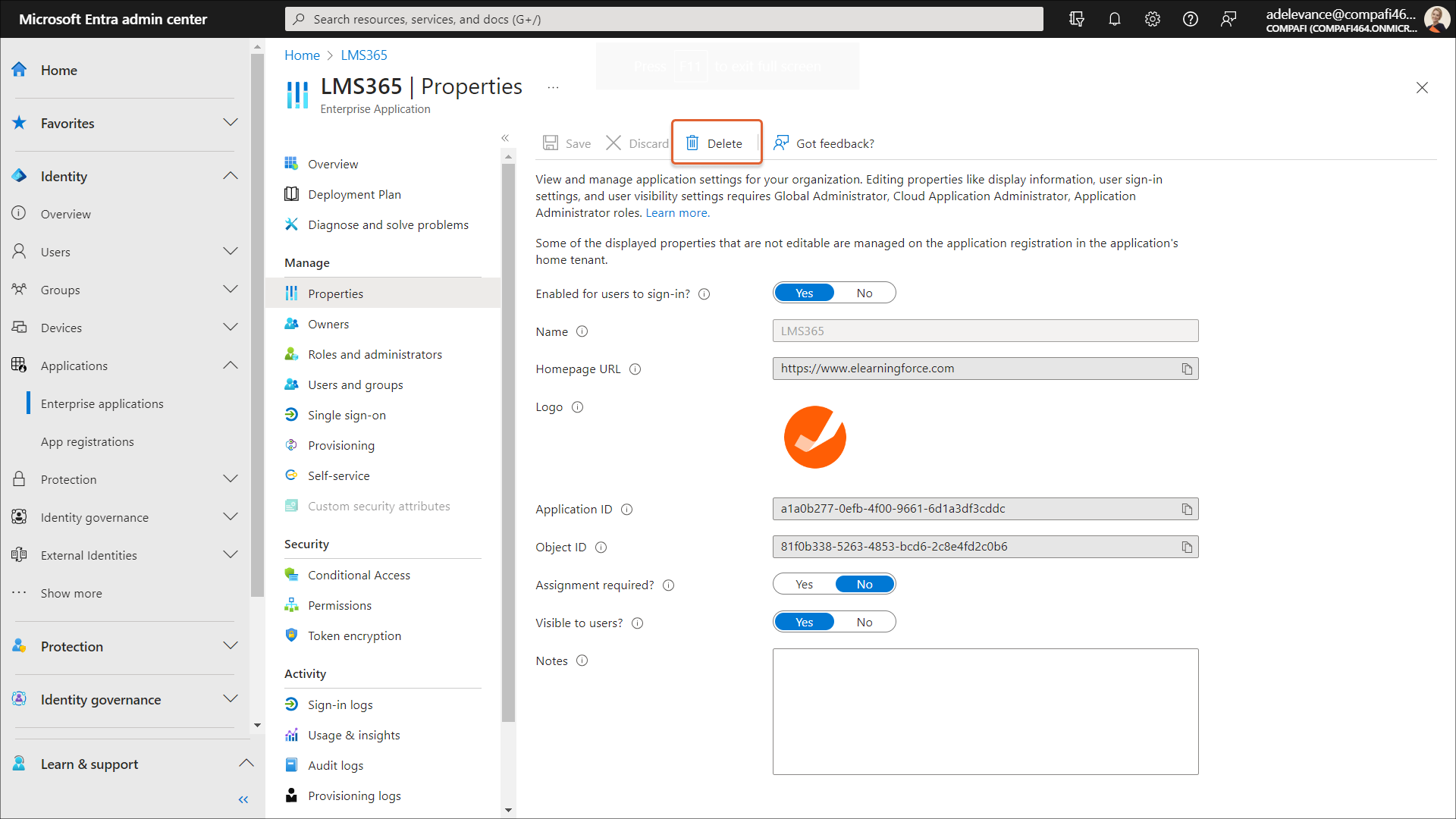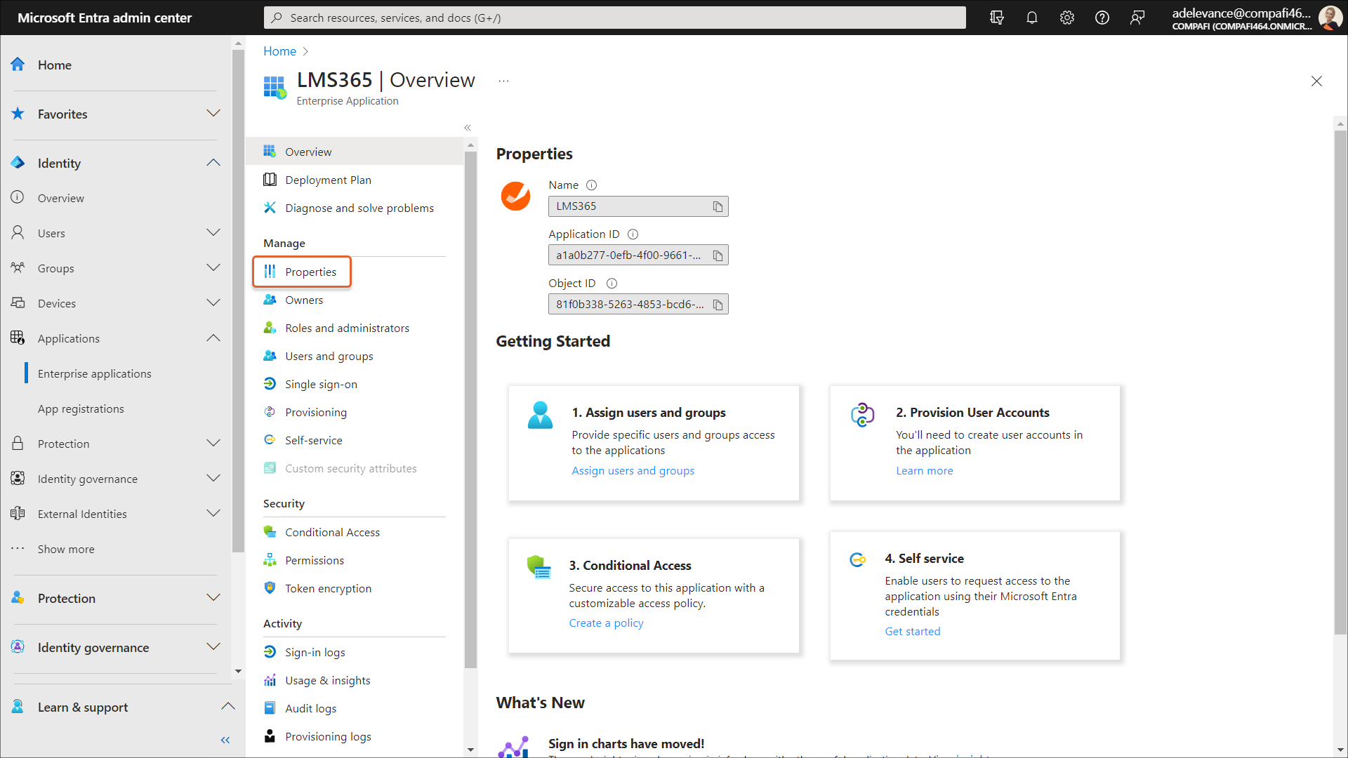 1. In the Microsoft Entra admin center, go to the Enterprise applications section and select LMS365 app from the list of apps. A page that shows the application overview opens.