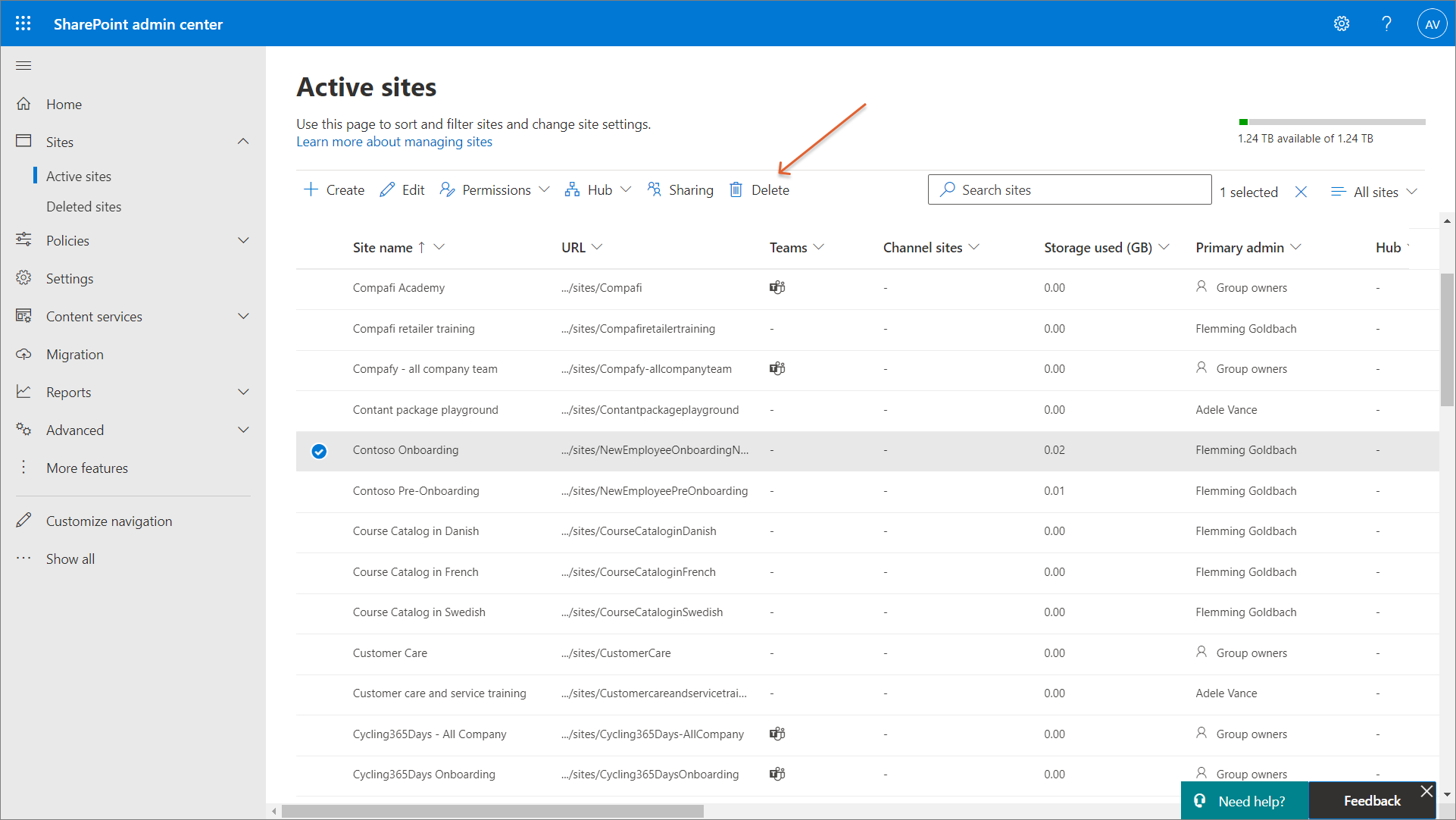 2. Select the site collection of the catalog you want to remove from the tenant and select Delete in the top menu. The selected site will be moved to Deleted sites under the Sites section.