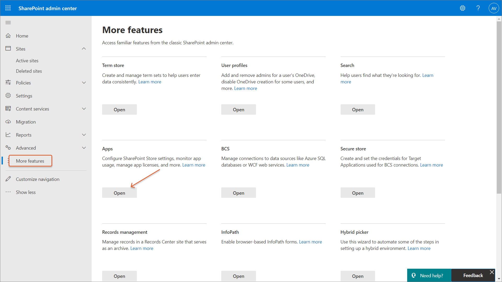 1. In the SharePoint admin center, in the More features section, select Open under the Apps section. The Manage apps page opens.