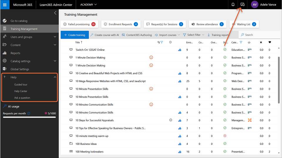 - Open the guided tour around the Learn365 Admin Center by selecting Learn365 Admin Center > select a catalog > Help > Guided tour. The tour interactively guides you through the main Learn365 features, such as creating a course, inviting users, etc.
