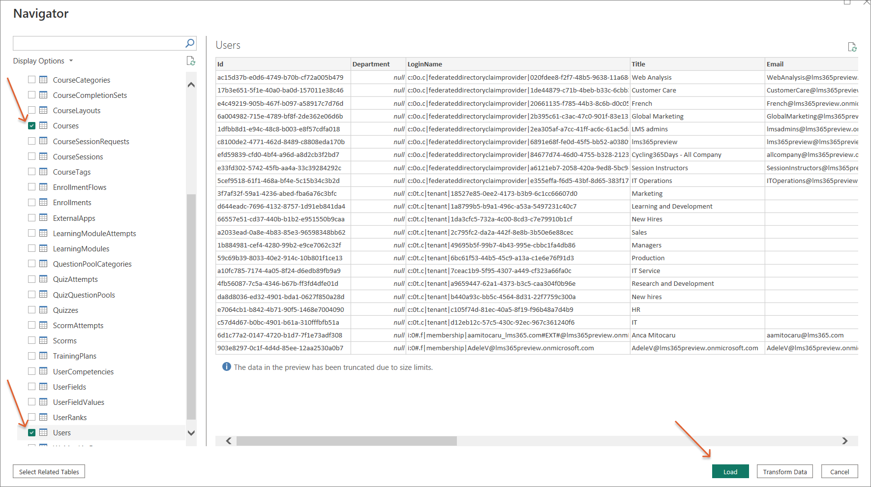 2. In the Navigator page, select the tables you want to add to your report and Load them. In this example, we've selected the Users and Courses tables. For detailed instructions on how to open the Navigator page, see this article.