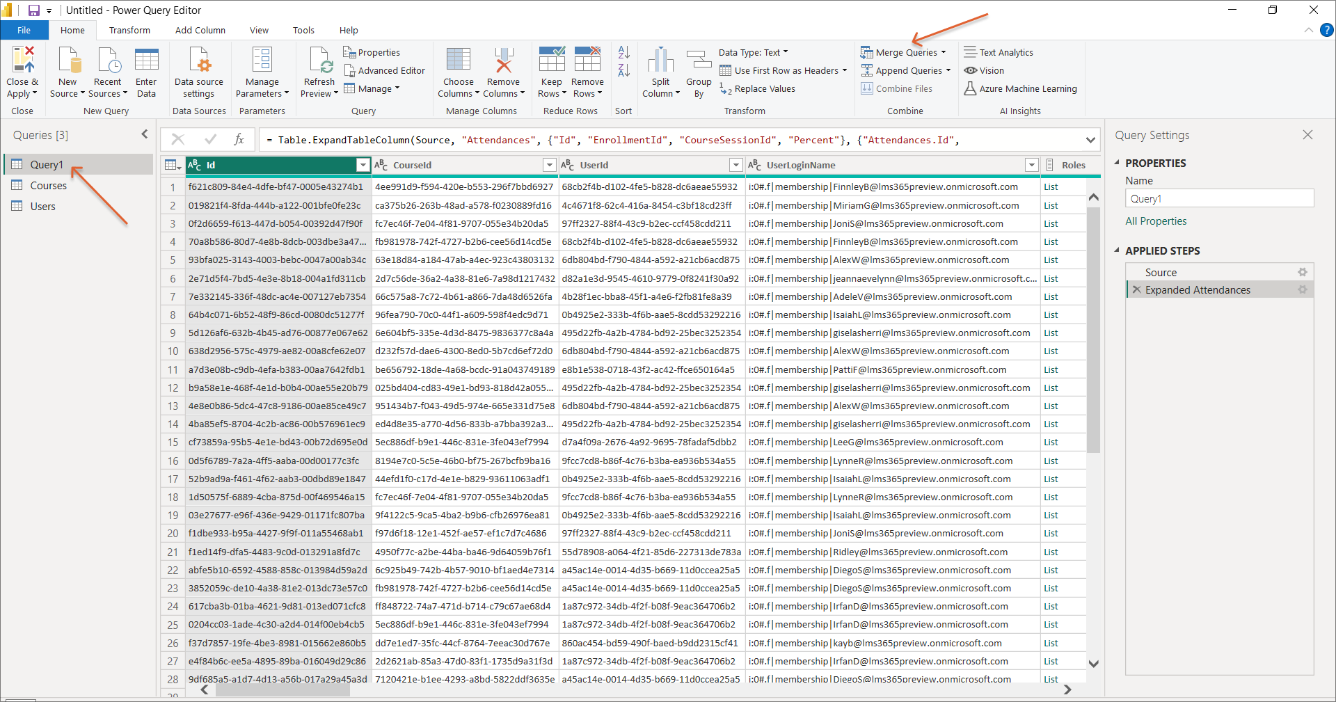 4. In the Queries panel on the left-hand side, select the Query1 table (the table you just uploaded that contains the Attendances columns) and select Merge Queries > Merge Queries.