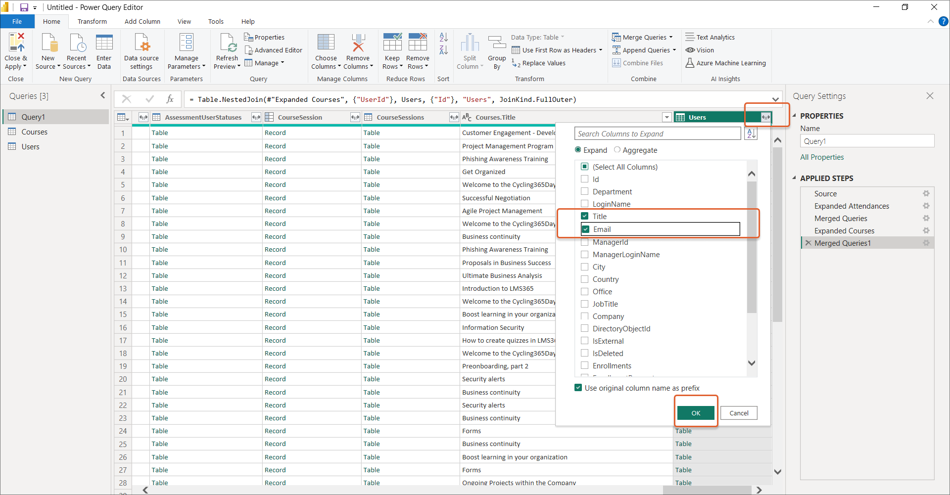 7. In the added Courses column, select the Expand icon and choose the columns you want to include. In this example, we've selected only the Title.