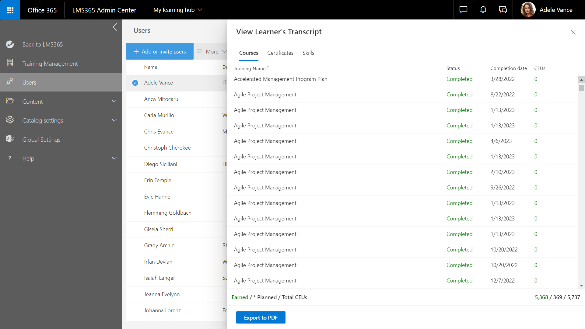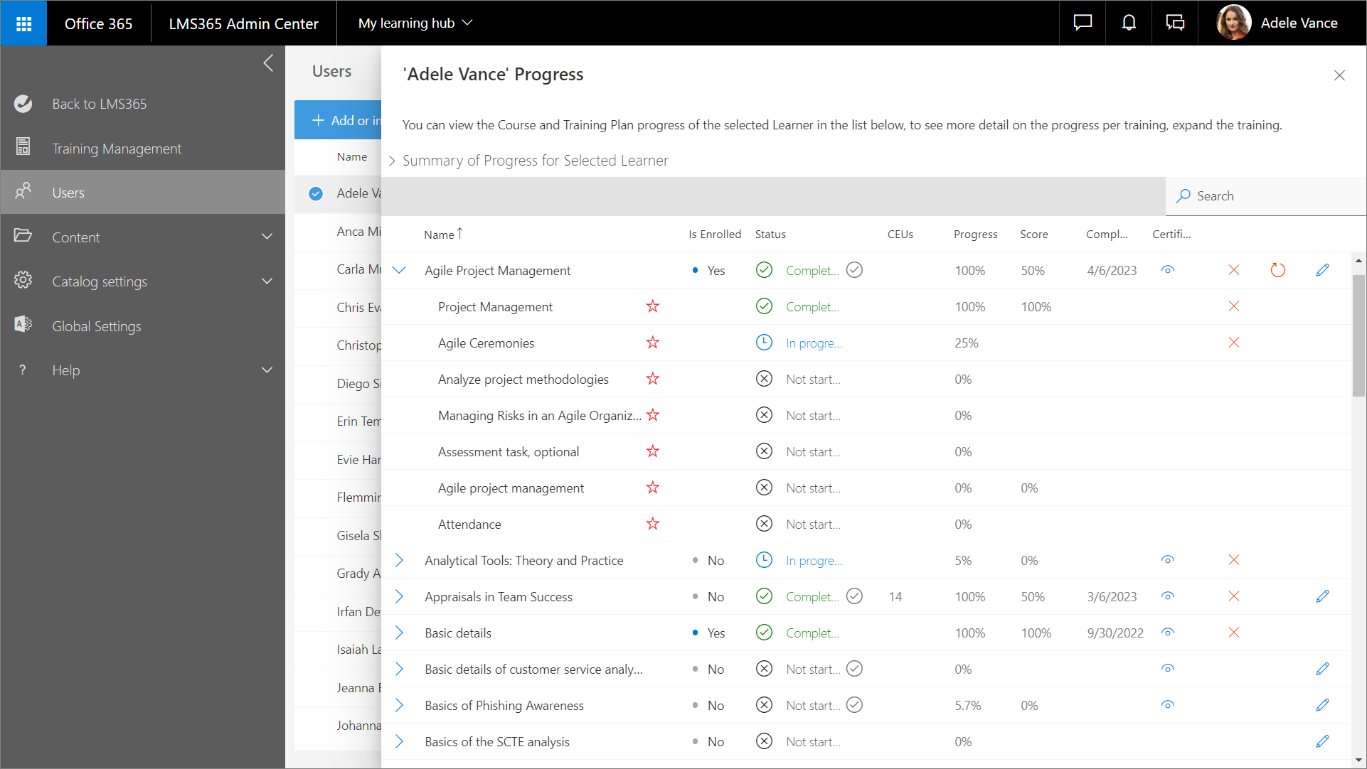 - Learners' progress for external training that was imported as a new non-Learn365 course