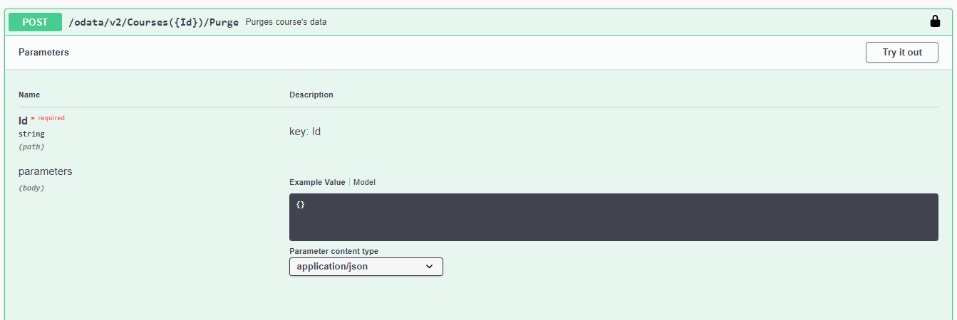 2. Find the Courses section, expand it, find POST /odata/v2/ Courses('{Id}')/Purge with the Purge courses's data description and then click Try it out in the top left corner.