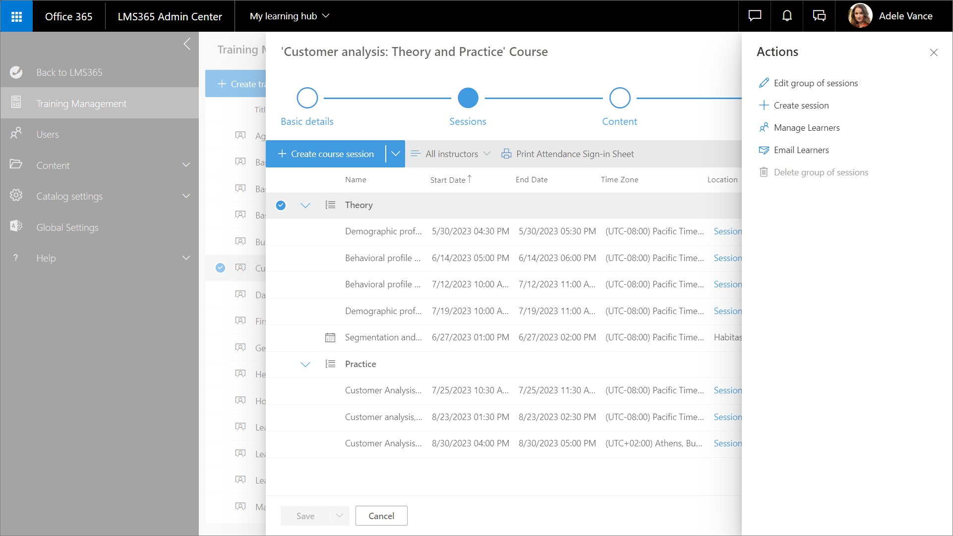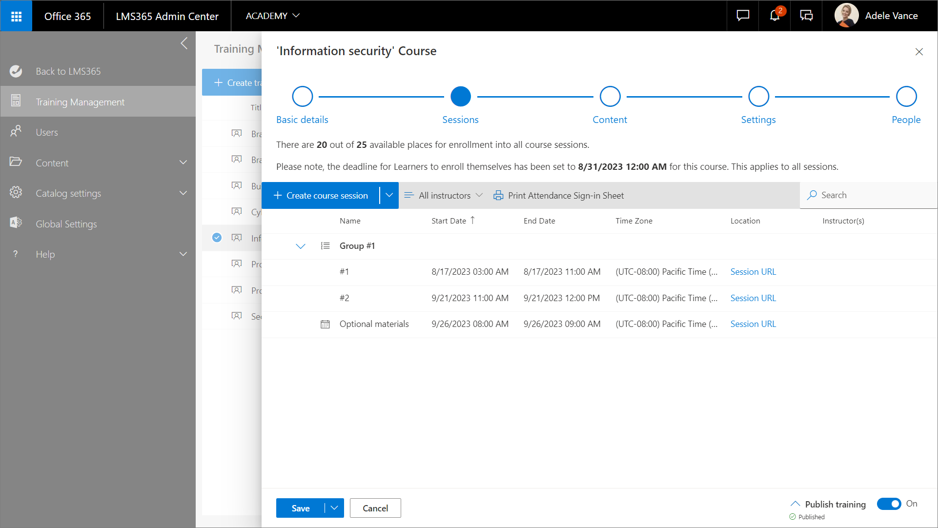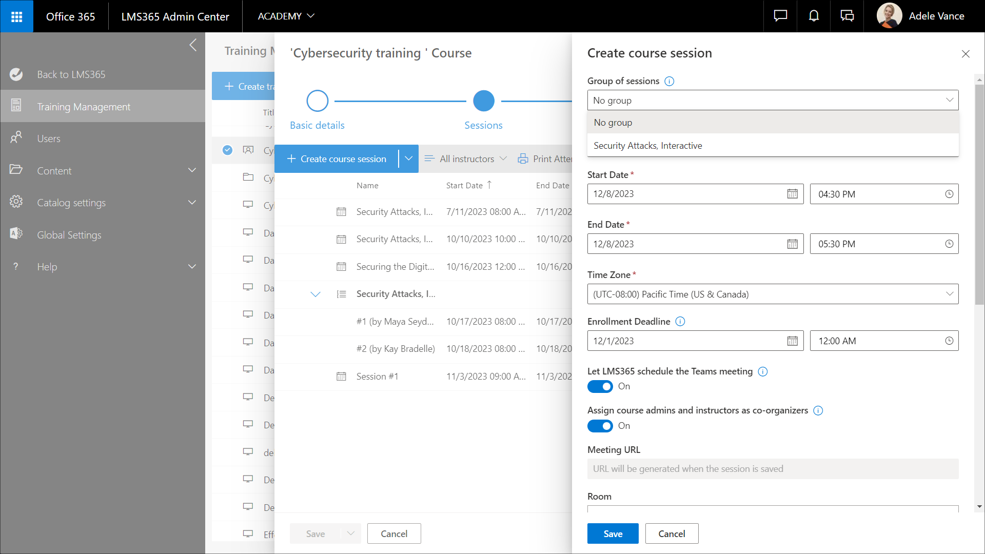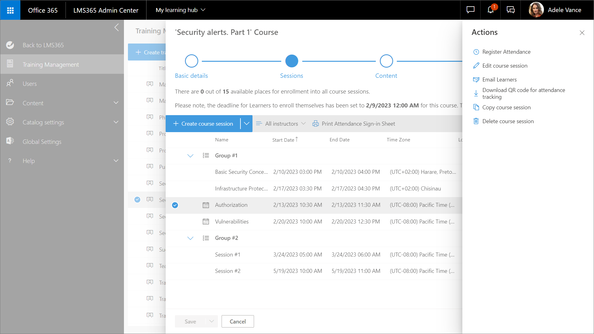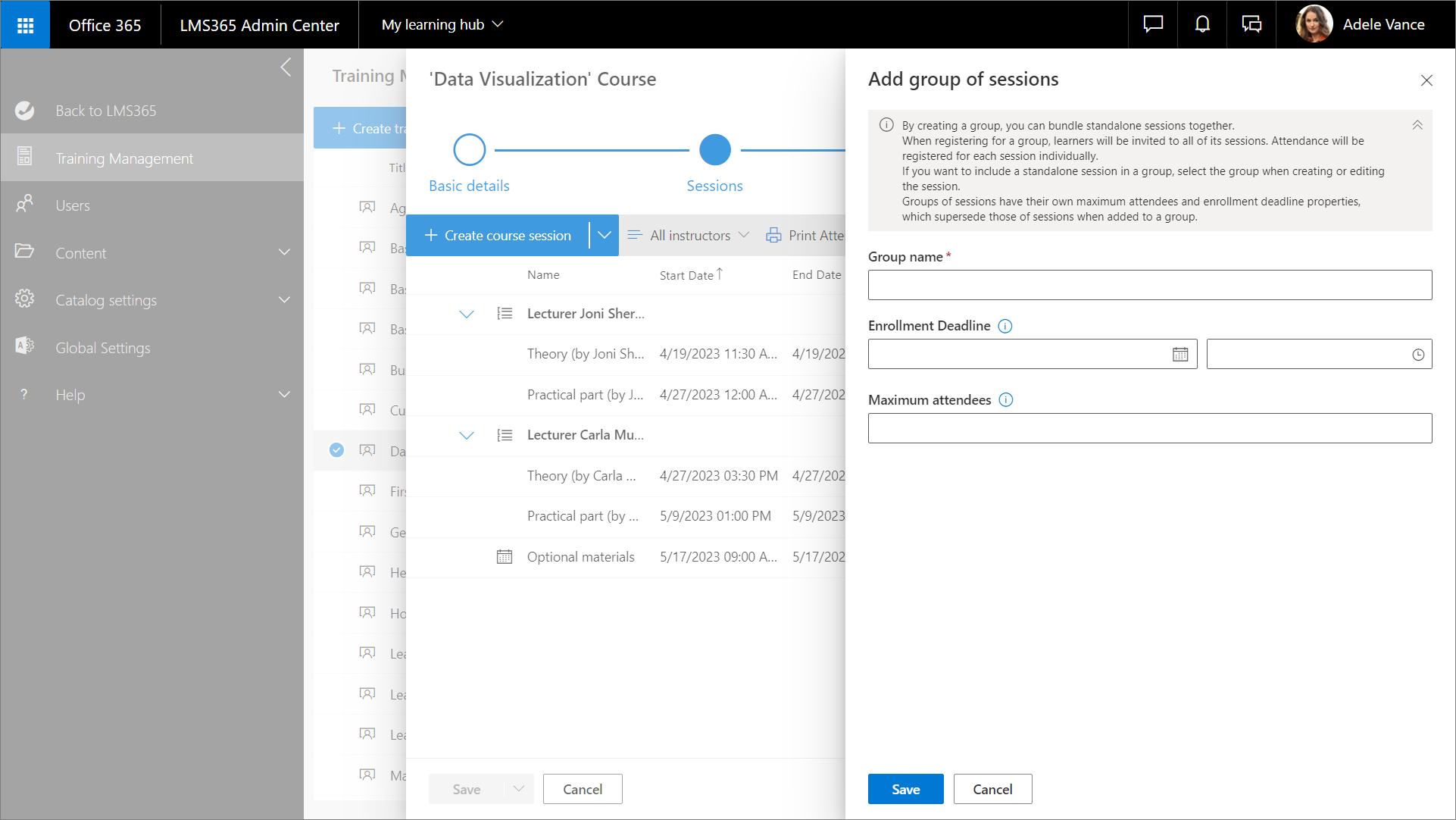 Sessions and session groups can be added to instructor-led training while creating or editing a course.