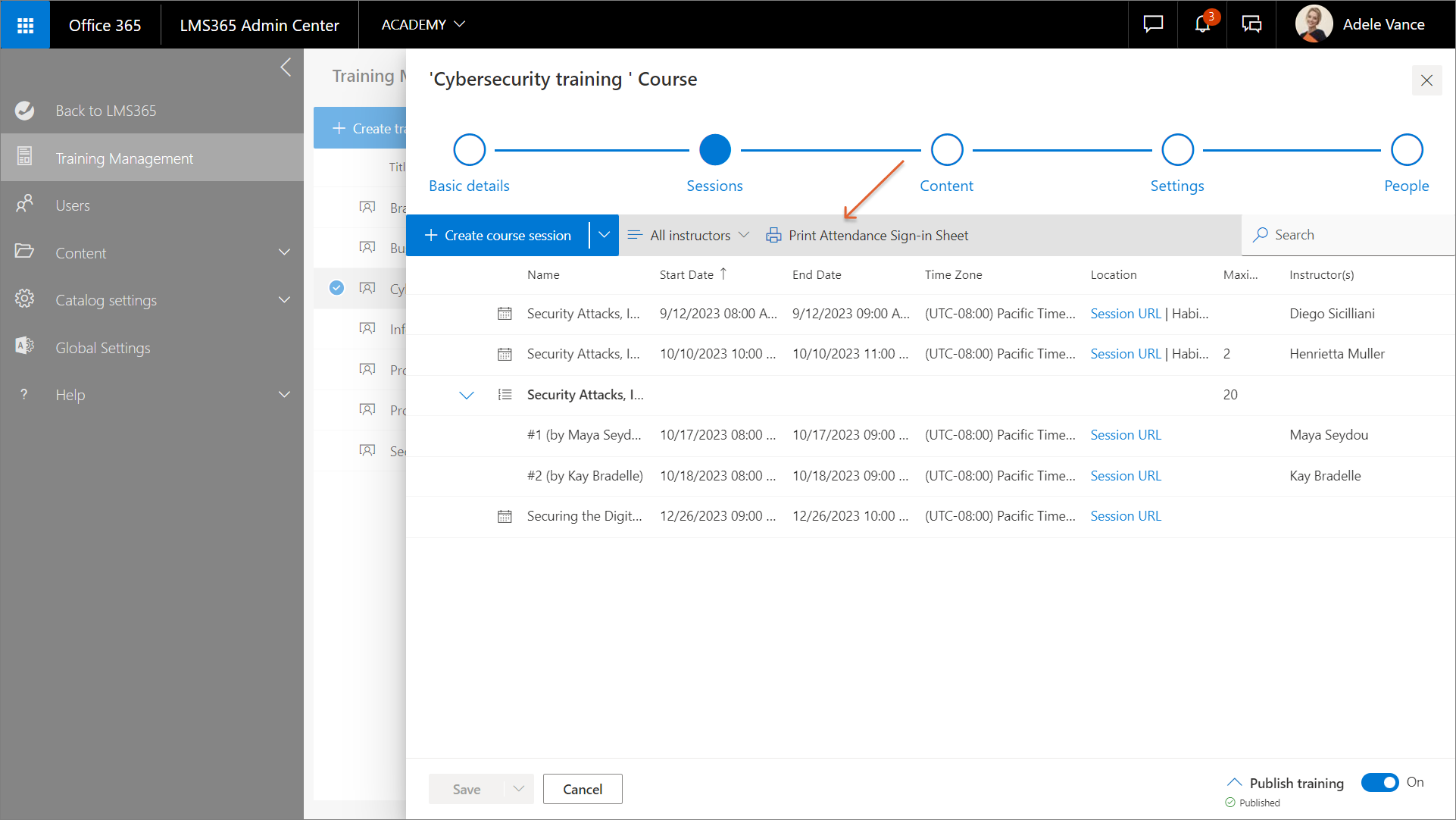 Detailed information about how to create Microsoft Teams meetings directly from instructor-led training sessions and how to manage the session organizers and co-organizers is available in this article.
