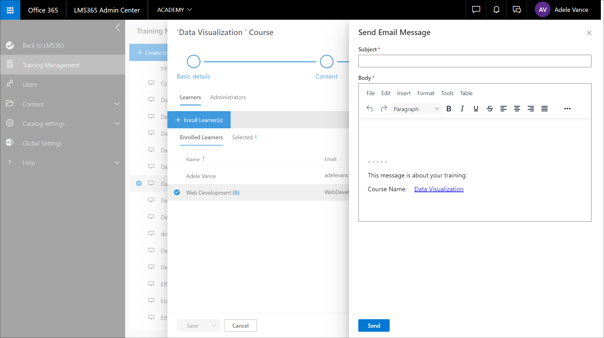 - The Send Email Message option is disabled if all selected learners don't have an email address registered with their account.