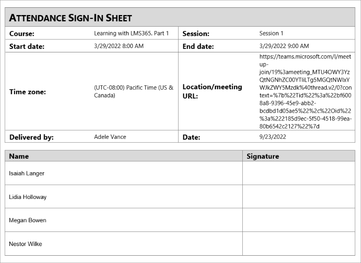 Delivered by. Displays the name of the session instructor. If an instructor isn't assigned to a session, the name of the course or catalog admin who printed the sheet is displayed.