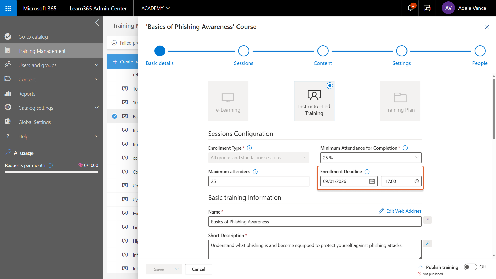 In this article, we provide an overview of the Enrollment Deadline option for instructor-led training. This option helps course and catalog admins, and session instructors, to avoid last-minute sign-ups and enables instructors to take the number of attendees into consideration when planning sessions.
