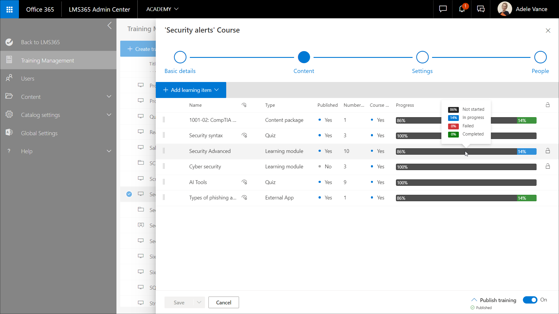 The Content section of the course edit panel gives an overview of the progress with the learning items in a course and shows how each learner is progressing.