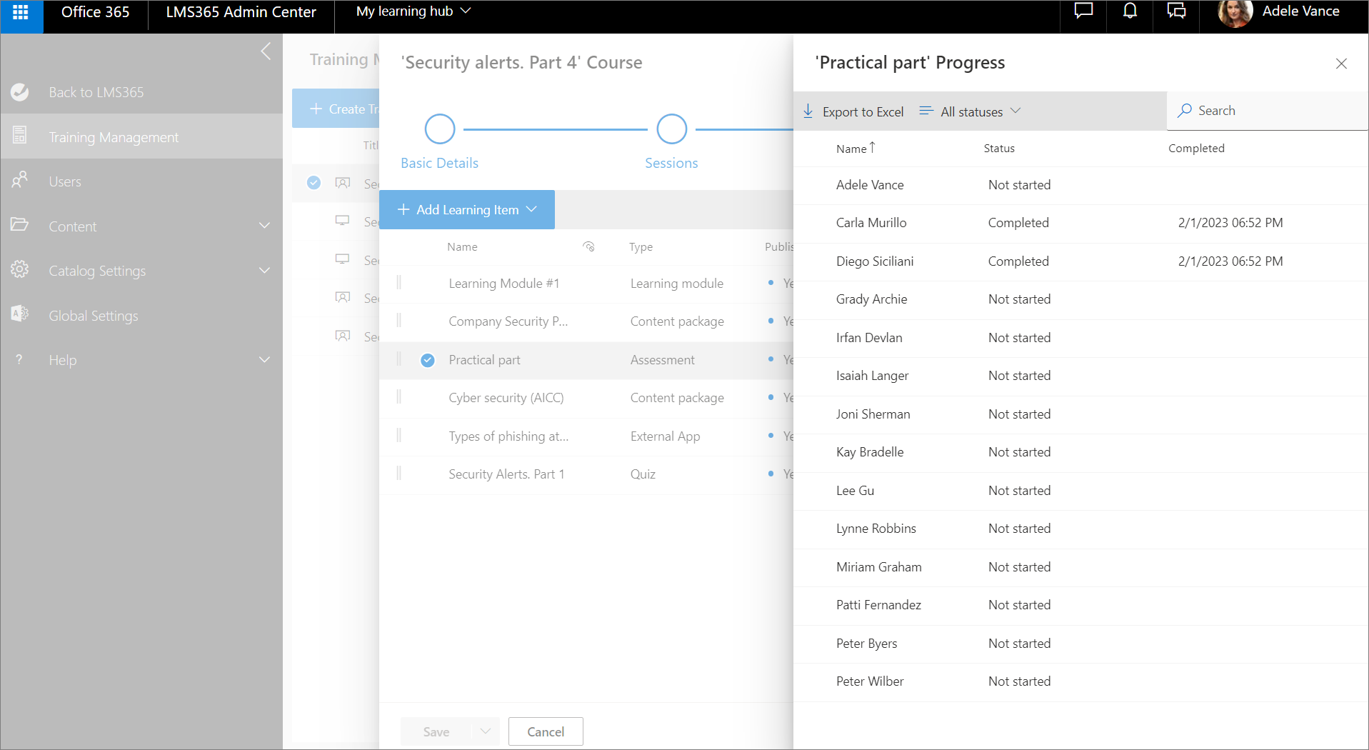 The opened learning module progress panel shows information about the learners. For detailed information about how to view learners' progress, export to Excel, and delete learners' progress for the learning module, see this article.