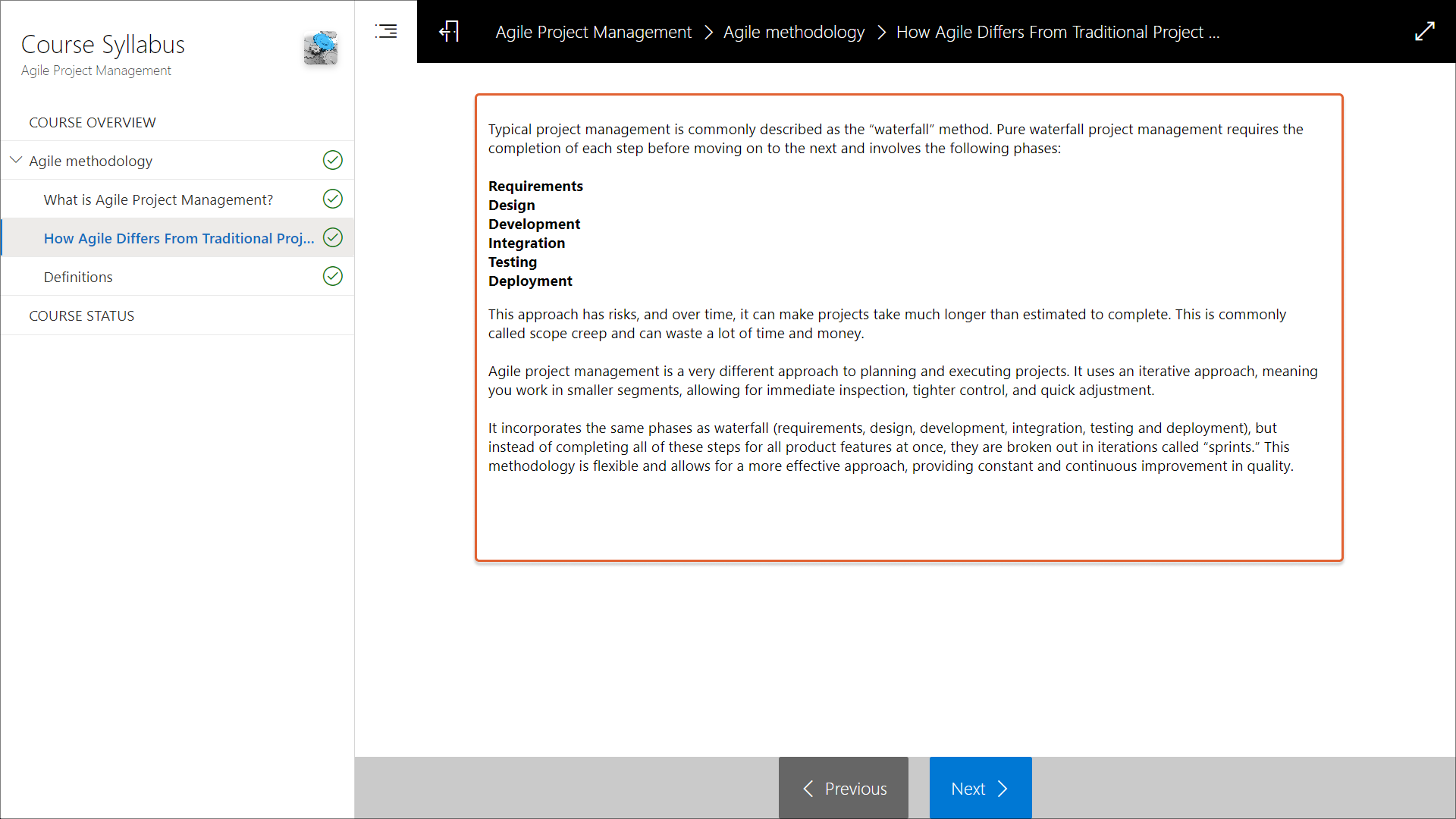 When the learner switches between learning objects, the screen reader focuses on the main content, not on the course syllabus.