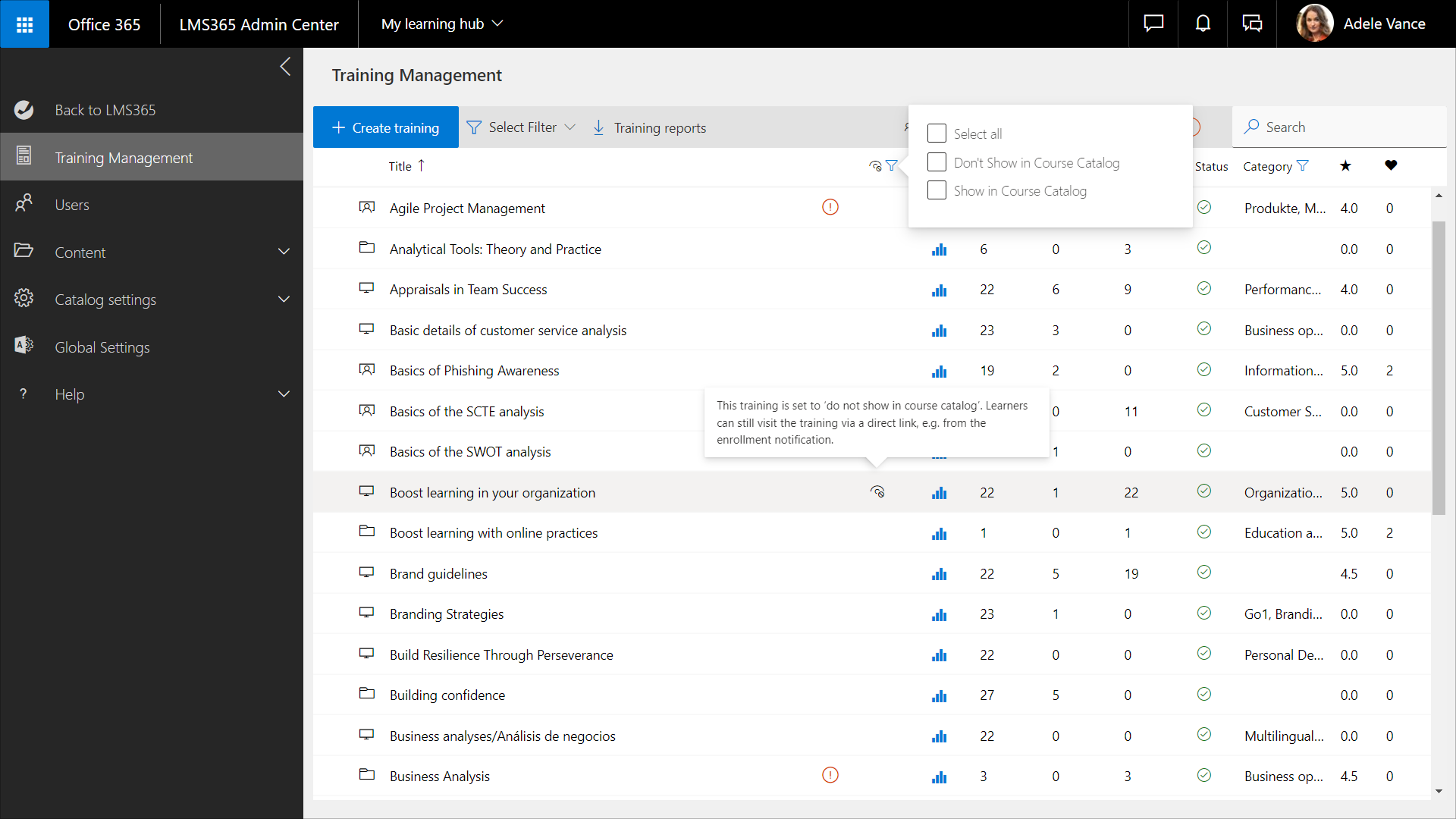 3. Filtering by visibility in the column heading enables you to select which courses and training plans are displayed: all, shown in catalog, or not shown in catalog.