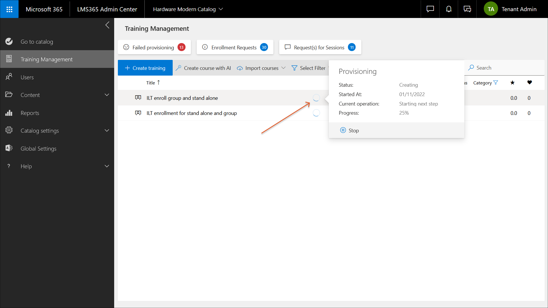 Any courses and training plans that are currently being provisioned are displayed with a spinning wheel icon next to their title. Select the spinning wheel icon to show the current provisioning status, the date the provisioning started, the current operation, and the progress indicated as a percentage.