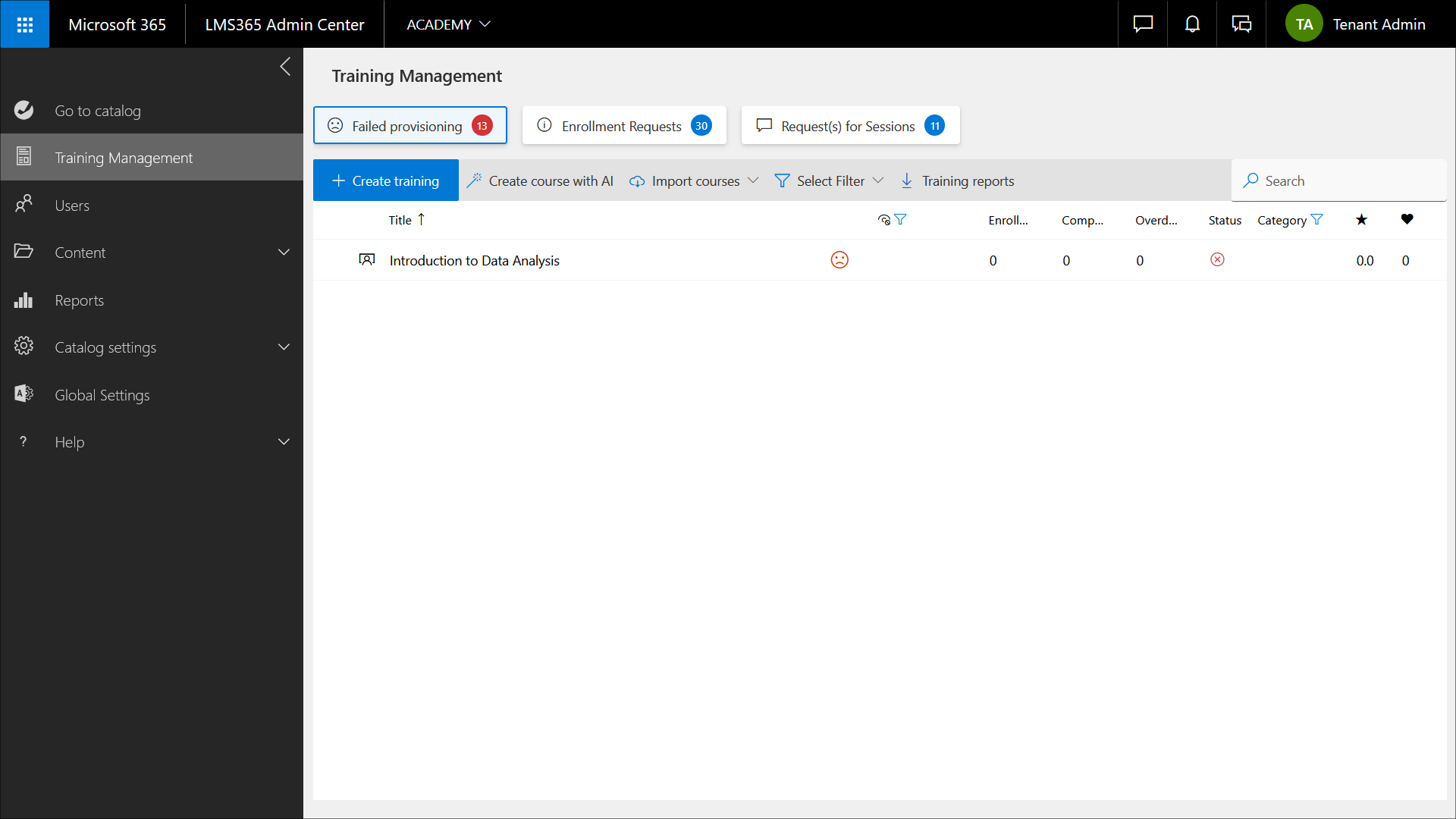 Select the Failed Provisioning filter to show courses and training plans for which provisioning has failed.