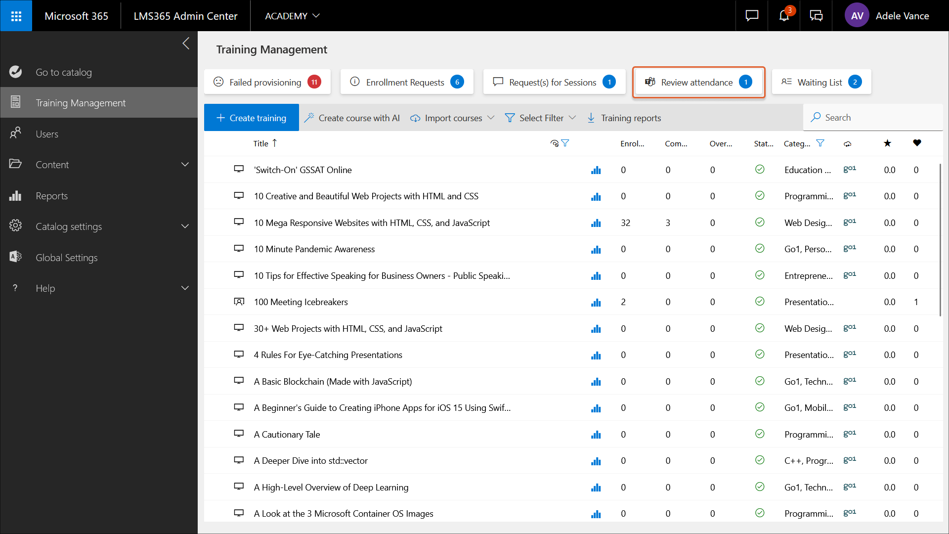 The Training Management page of the Learn365 Admin Center provides an overview of all courses and training plans in the selected catalog, the ability to create or import training, and various training management options.