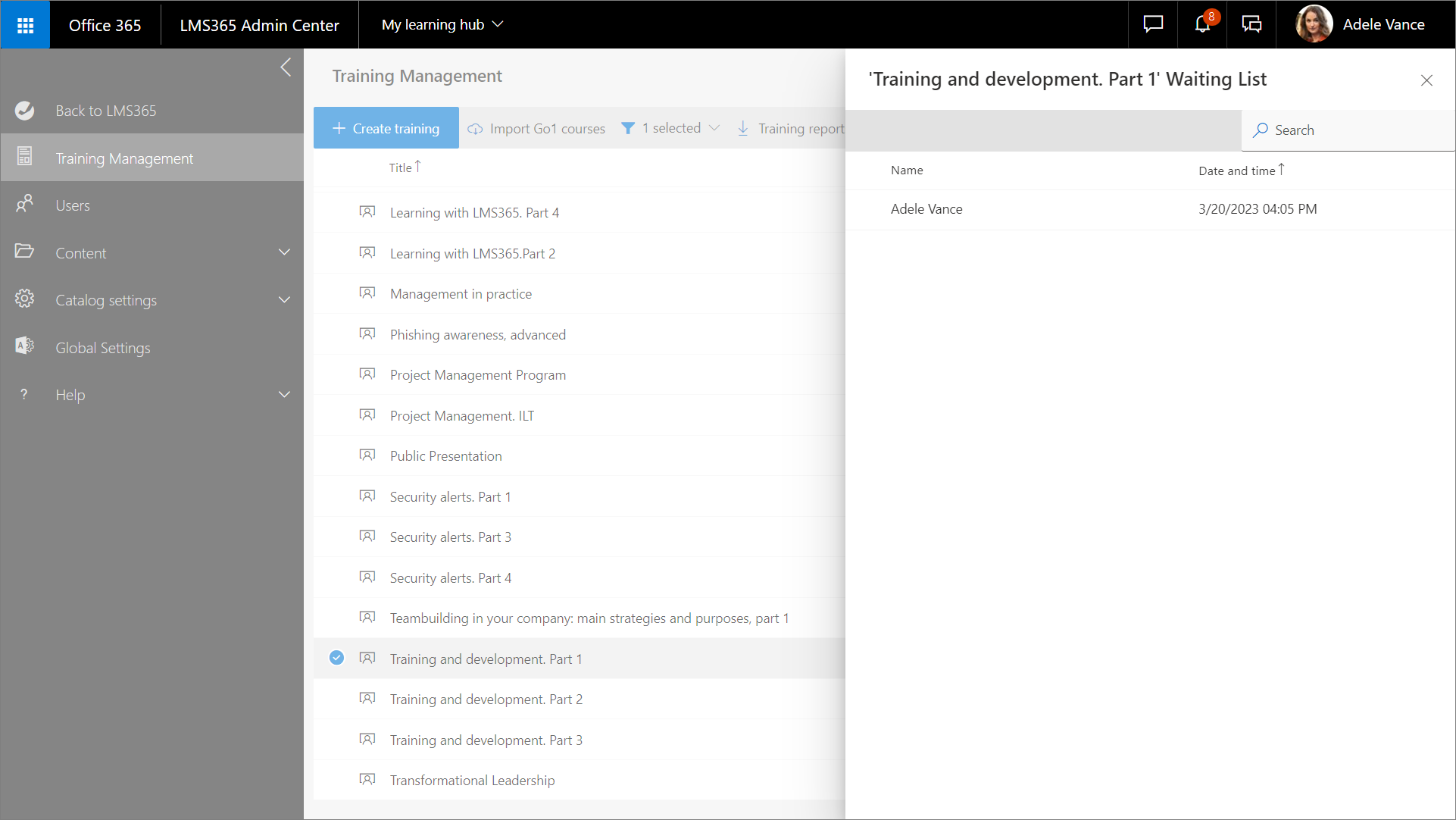 To manage courses and training plans, course and catalog admins select the relevant course or training plan on the Training Management page to open the Course management panel or the Training Plan Management panel respectively.