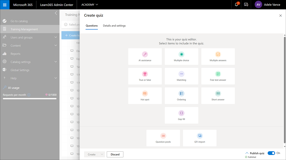 When all the necessary fields are completed, select Create to create the quiz or Create and close. Otherwise, select Discard to cancel quiz creation.