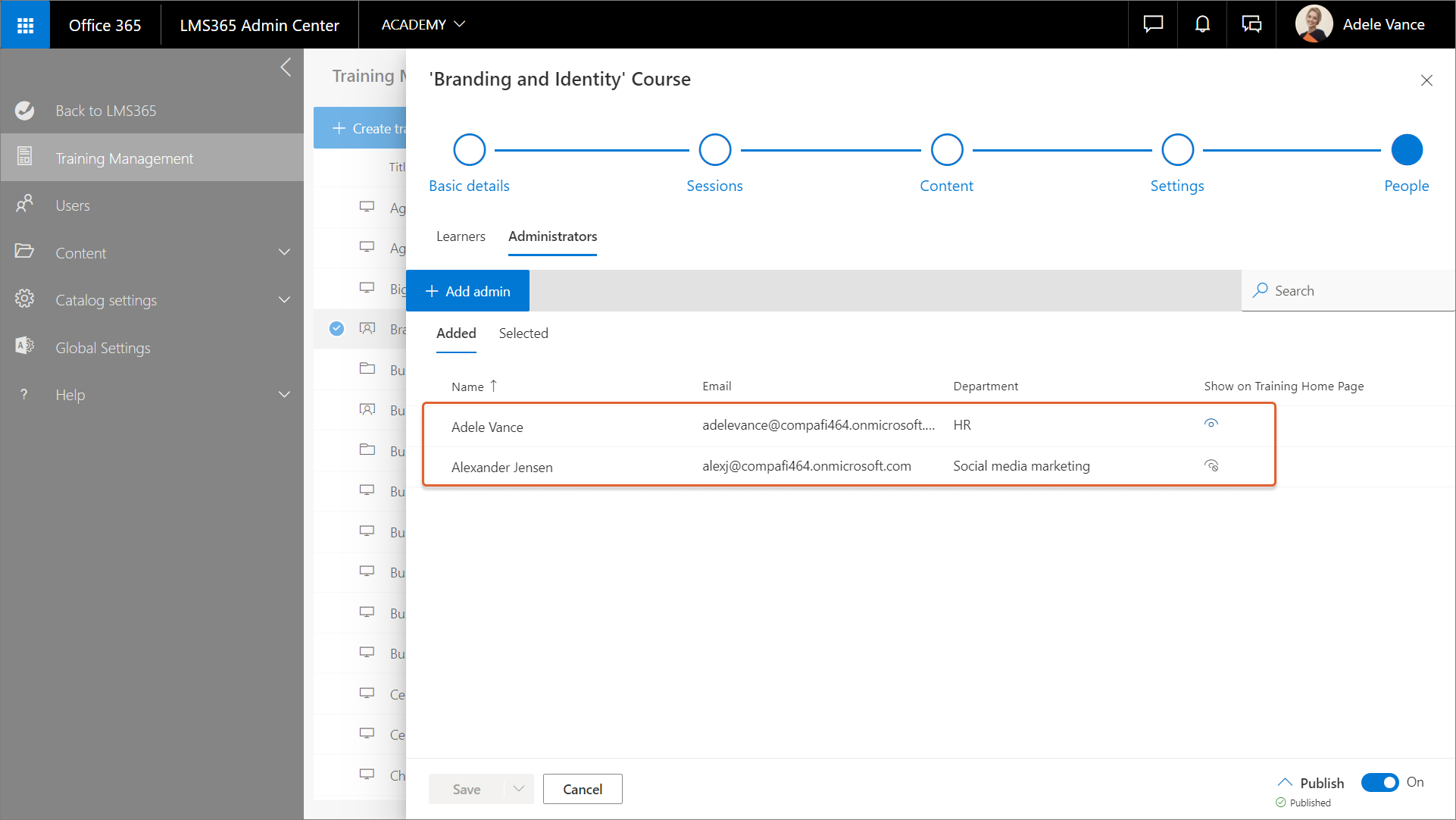 There is one course admin assigned for a course and the Show On Training Home Page option is disabled for this course admin.