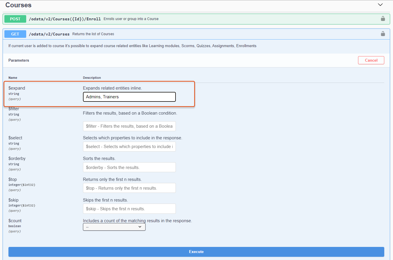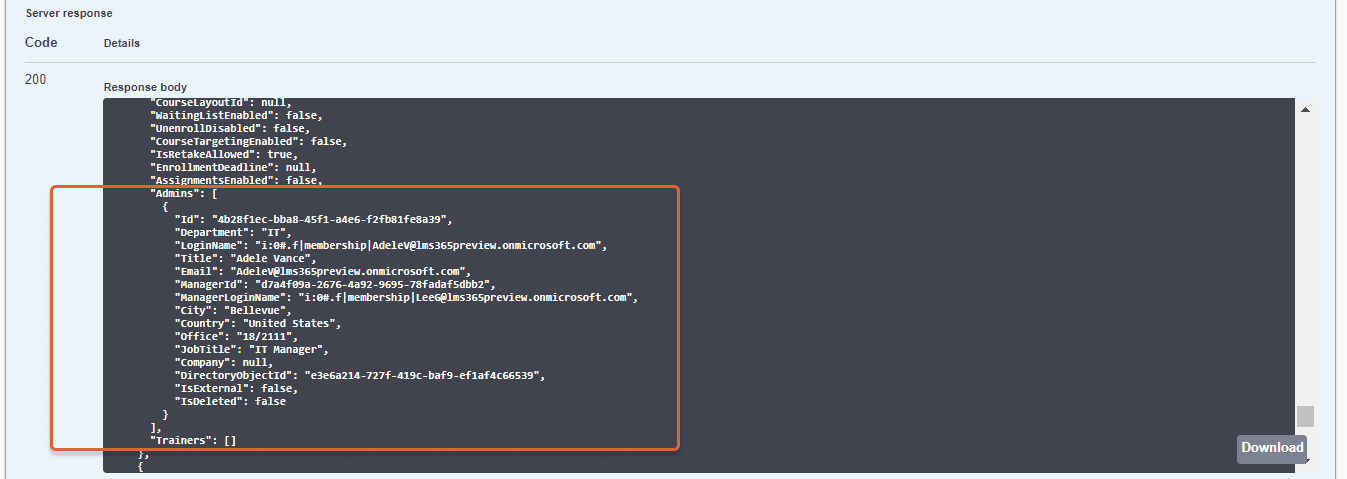 The Course entity used in API has two properties— Admins and Trainers— that can be used in the $expand query option of a request. This article describes who are the users that correspond to these roles and how they will be displayed in the API response.