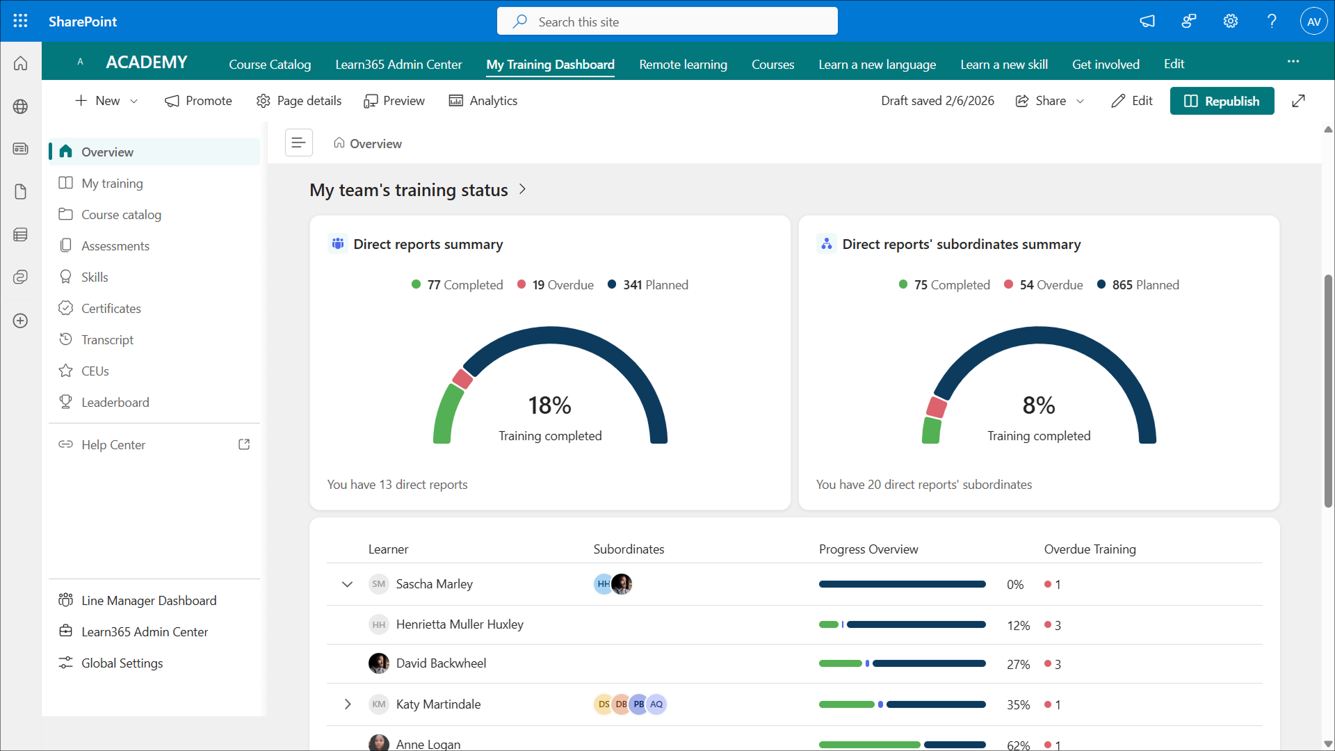 - Overdue Training enrolled, not Completed by Direct Reports. Shows the tenant-wide percentage of courses that have a due date in the past (including courses that are part of training plans) and haven't been completed by the line manager's direct reports. Inactive courses with a due date in the past aren't included in this calculation.