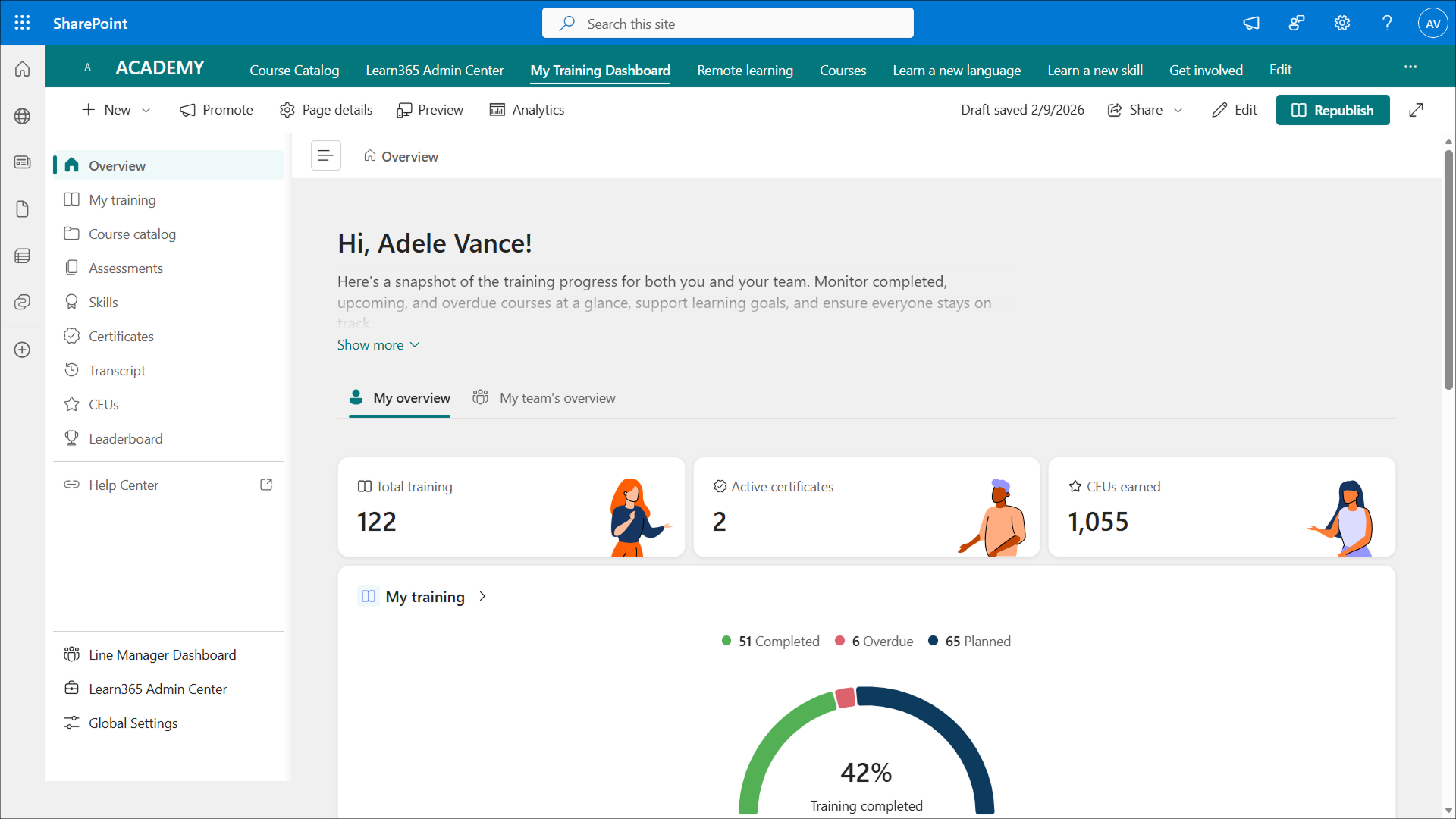 The Overview section provides information about current and upcoming courses and training plans and may be divided into two tabs: My overview for all learners, and My team’s overview, which is available to line managers, proxy managers, and delegates only. The tabs are further divided into sections.