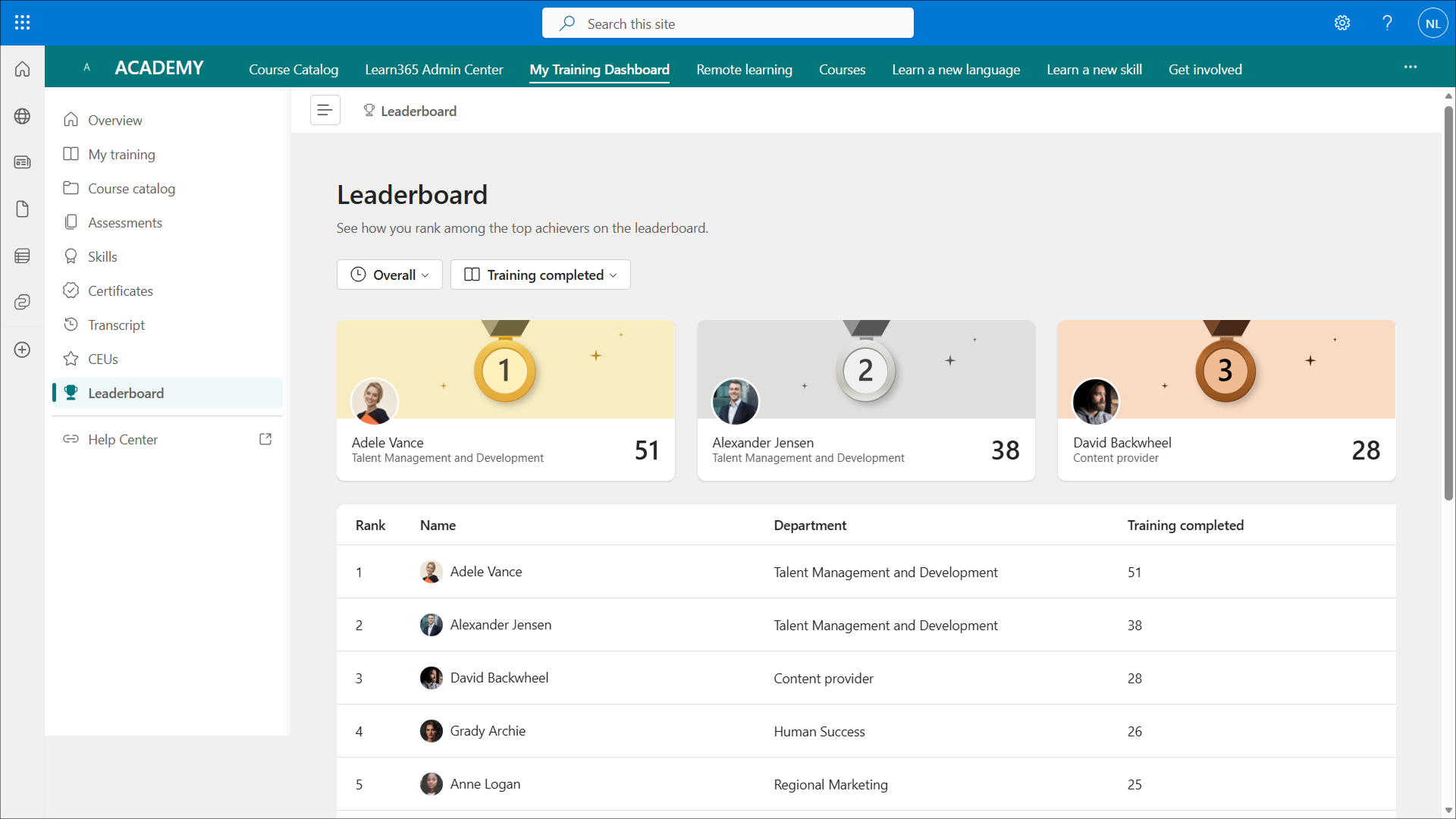 The Leaderboard section displays the ranking of users on the tenant based on the total number of completed courses and training plans, earned CEUs, and acquired certificates. It also includes a podium of the top three learners in each category, complete with gold, silver, and bronze medals displayed with their picture.