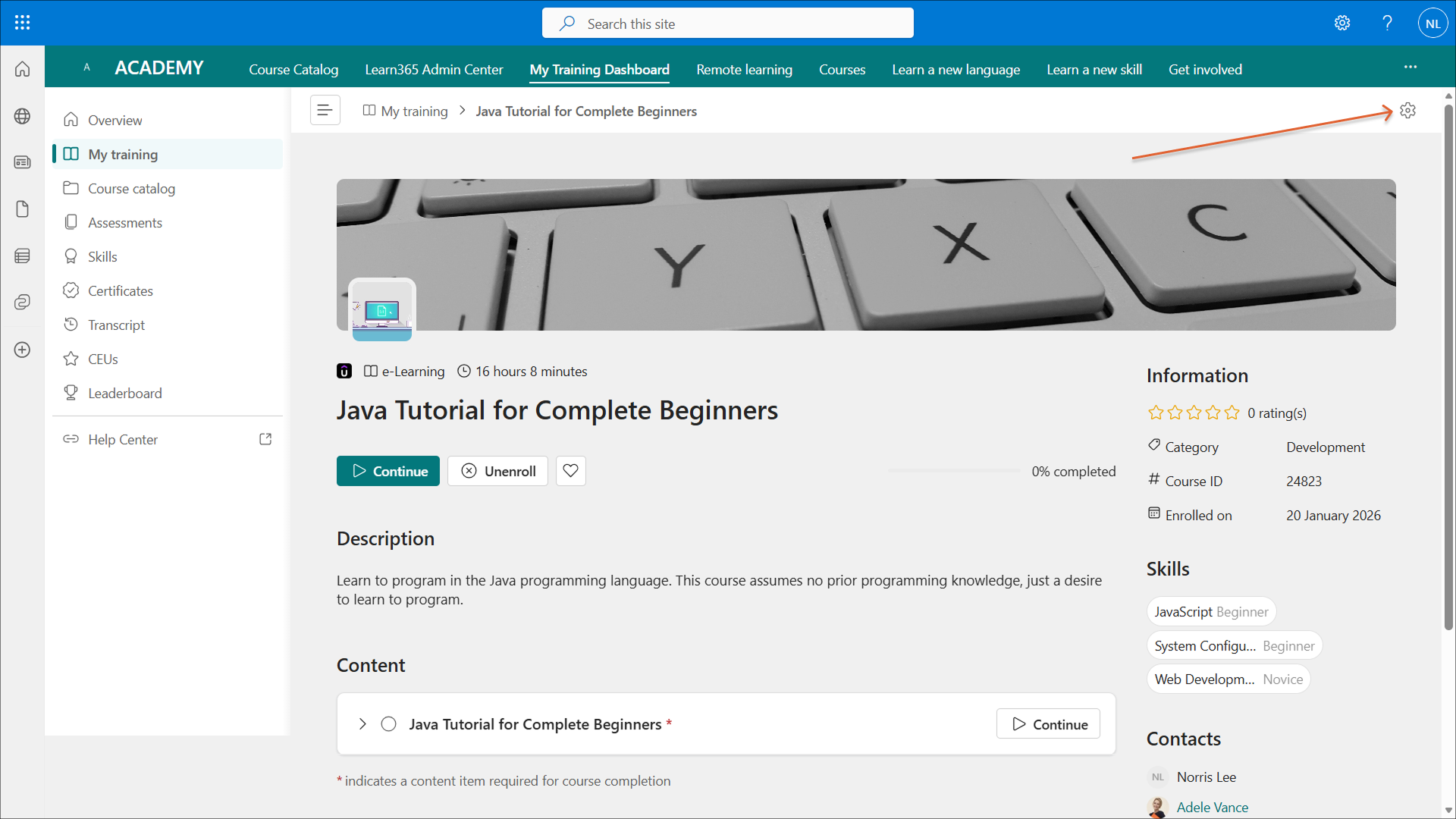 The cog icon for the menu is displayed on the training home page when a course or training plan is accessed via the left navigation bar on My Training Dashboard.