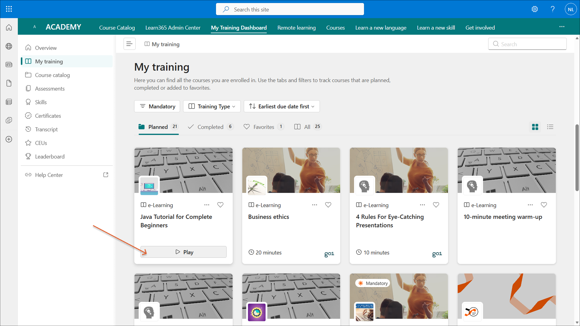 • From My Training Dashboard > My training, select Play on a course card (in card view) or on the course row (in list view). They're redirected to the Learn365 player, which opens on the first incomplete learning item of the course. The course syllabus is displayed in the left navigation. For more information about the My training section, see this article.