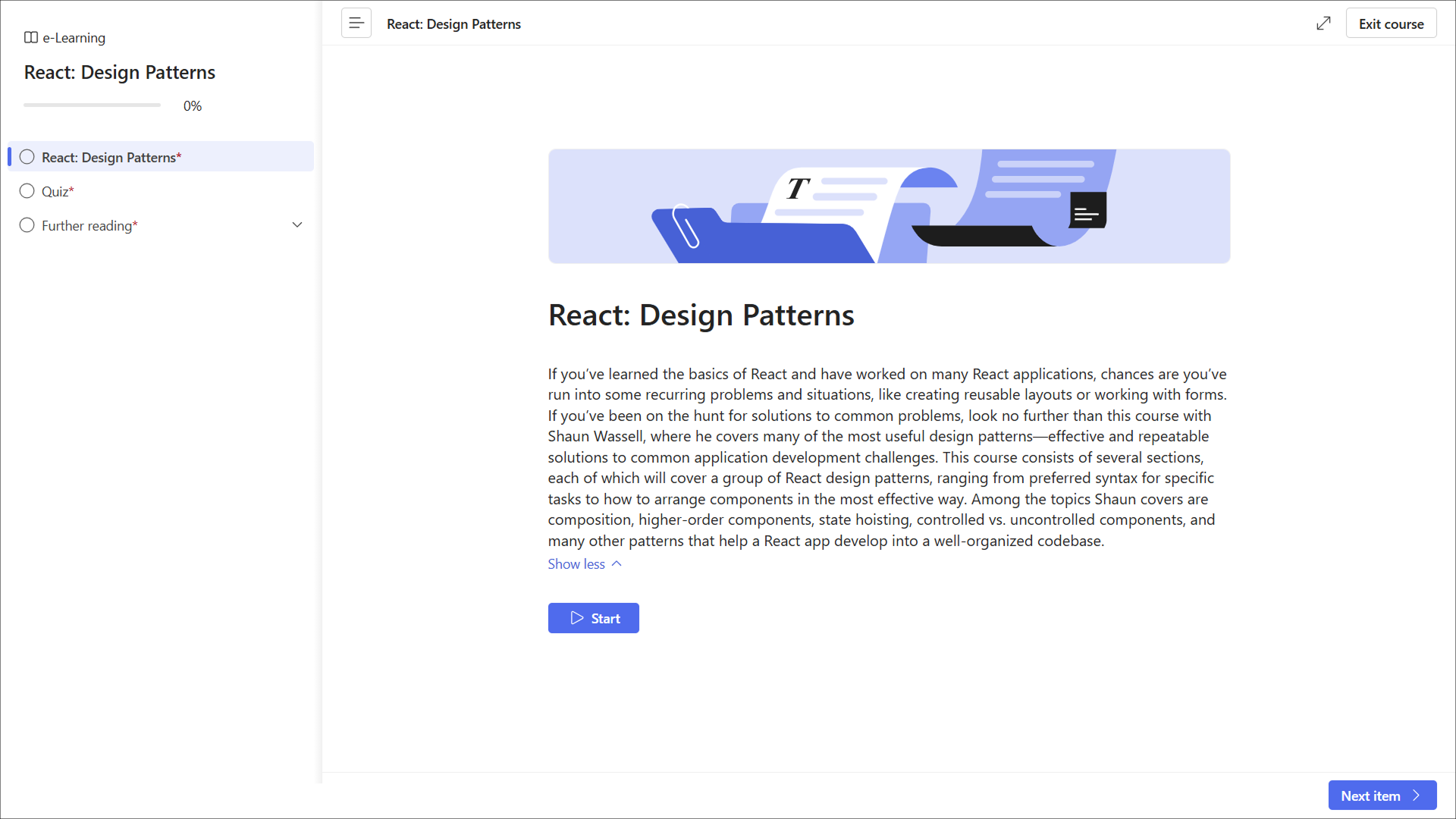 When a learner starts a course, the Learn365 player opens on the first learning item of the course and the course status changes to In Progress. If a learner is continuing a course, the Learn365 player opens on the first incomplete learning item.