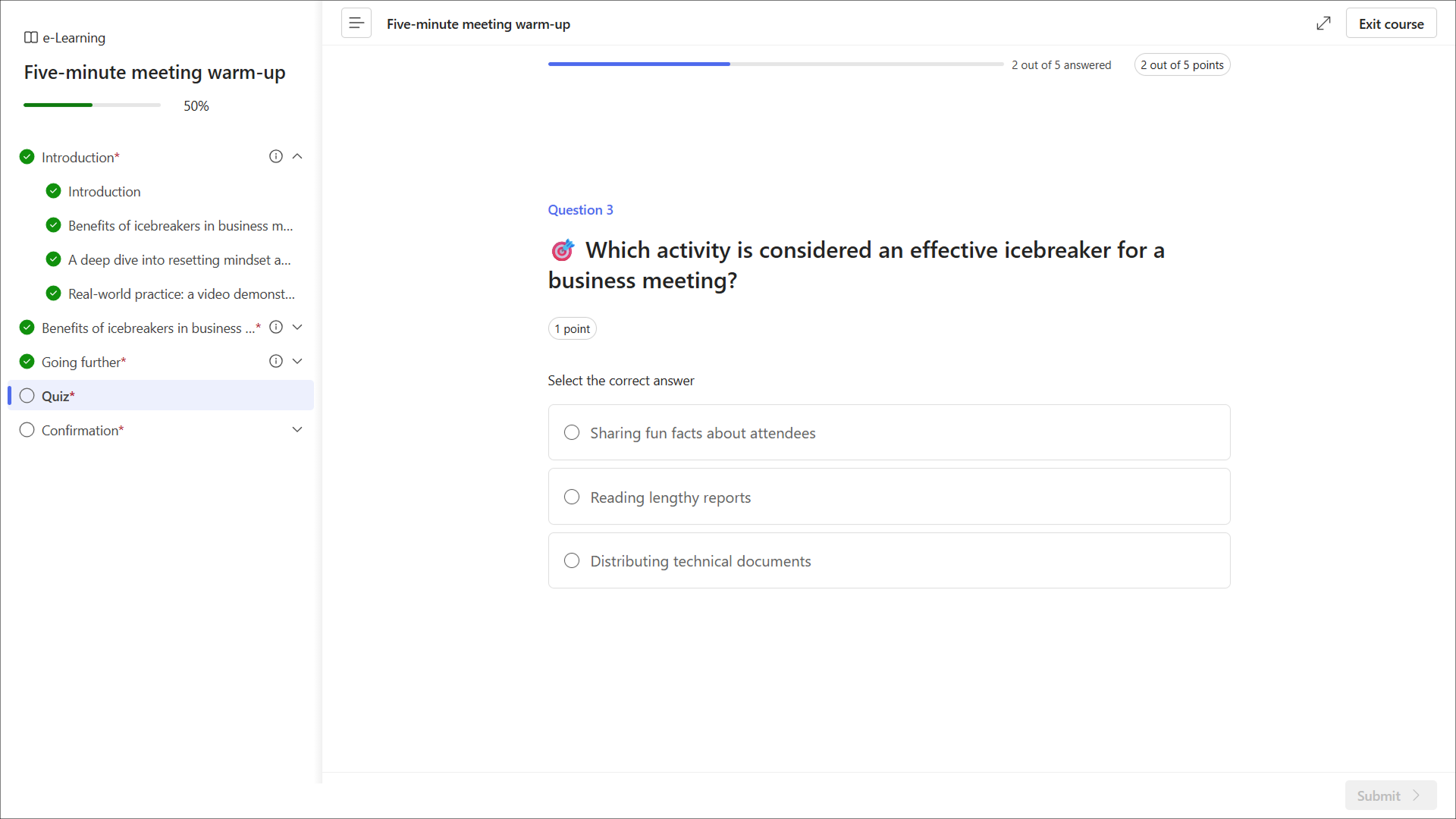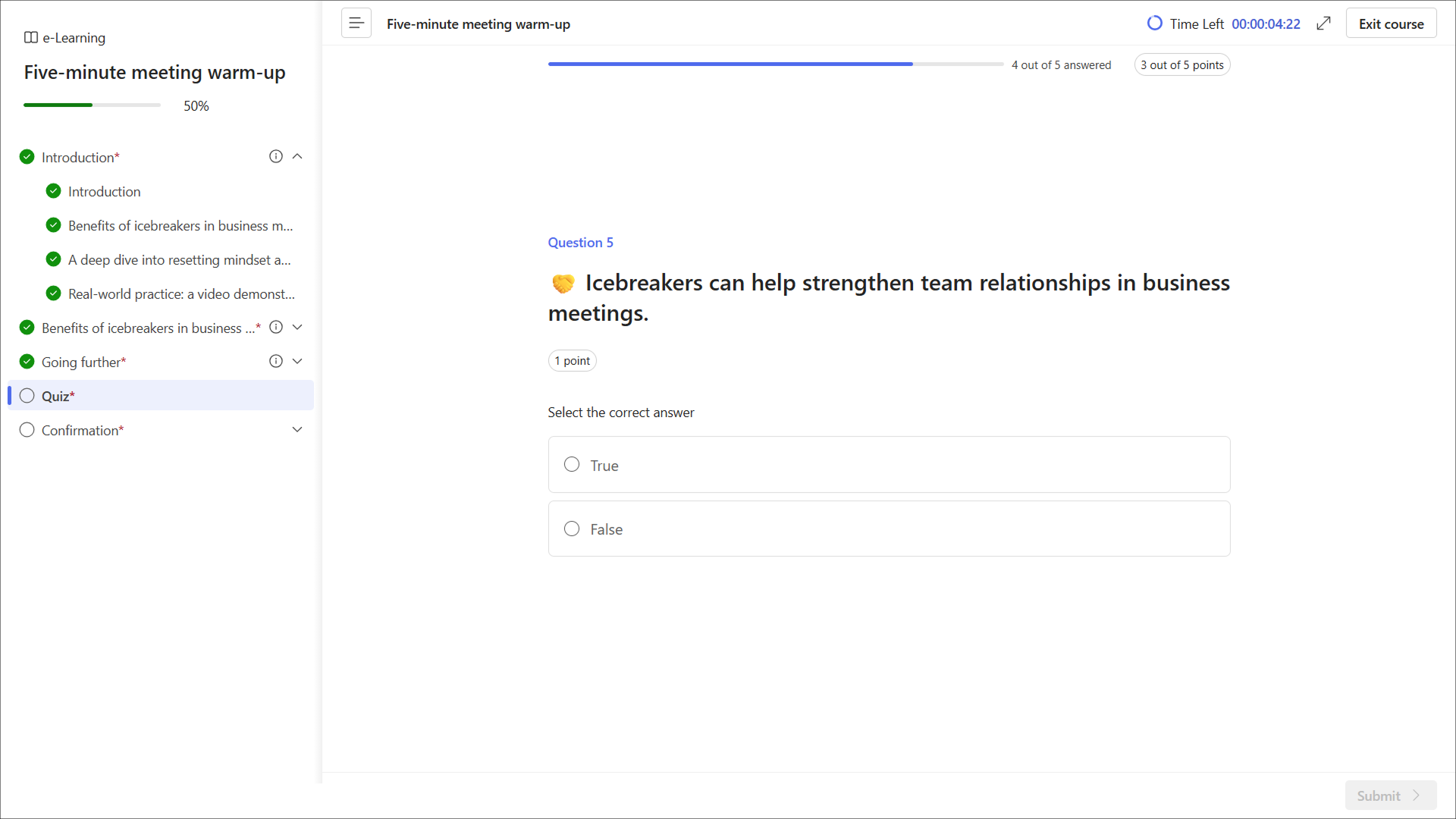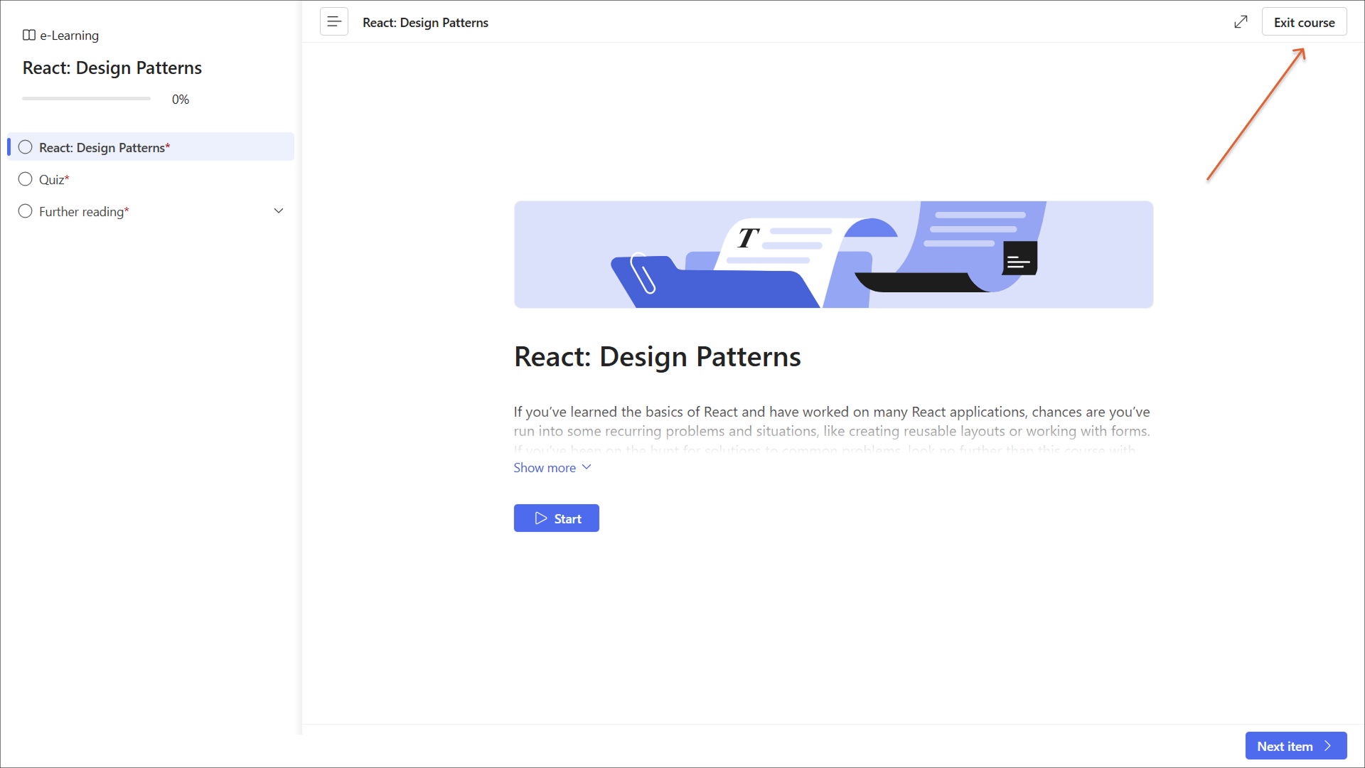 Learners can select Exit course in the top right-hand corner to return to the course home page.