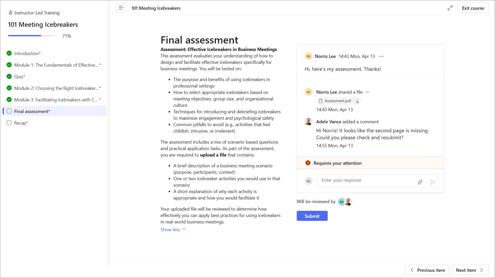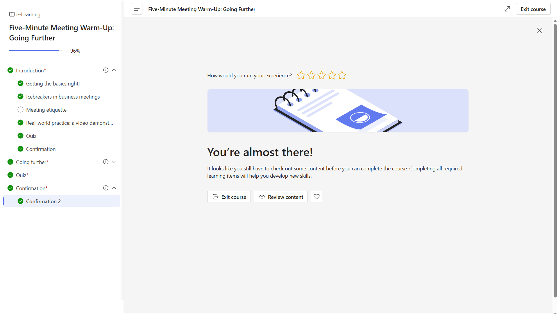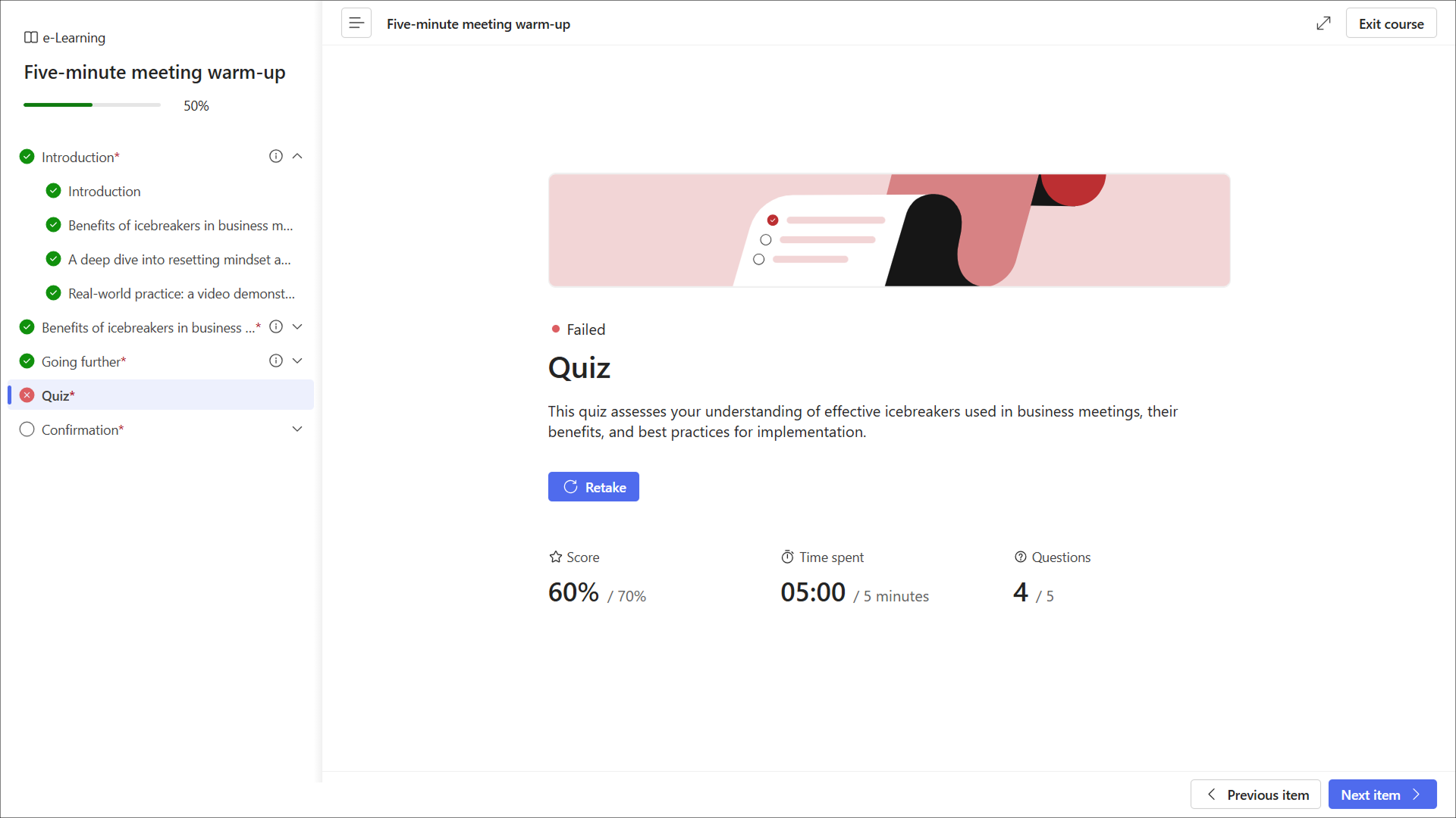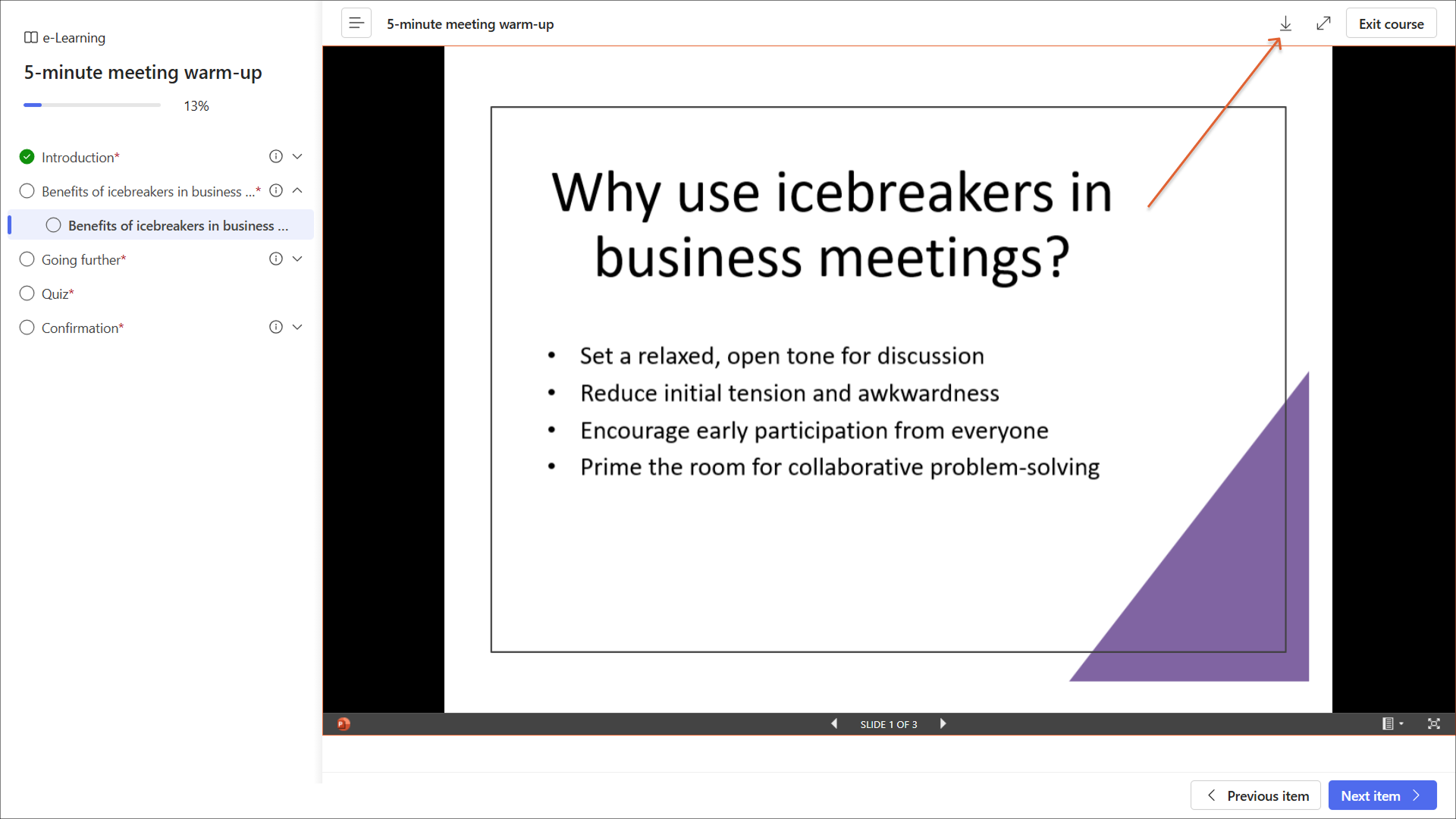 Learners can select Exit course in the top right-hand corner to return to the course home page.